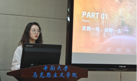 接着,阳倩以学生的一封信拉开序幕,通过介绍她的支教生活及“线上阳光课堂”的创办讲述她的支教经验。自2017年起,阳倩通过面试选拔成为湖南省慈善总会“衣恋阳光家教”项目领队。在担任领队期间,她带领团队共组织了2次学期家教、8次假期家教活动和4次暑期支教活动。该项目截至目前为止,所帮助的贫困学生总数累计已达1395人,项目志愿服务总时长累计已达7727小时,项目的社会影响力日益扩大,并受到了省领导的高度重视和肯定。在新冠疫情爆发期间,为响应国家“全民防疫”号召,组织志愿者通过远程线上和就近线下相结合的方式,为近百名滞学在家的贫困学生提供免费家教和心理疏导服务。她作为志愿者切身参与了2次学期家教和2次假期家教,并在湖南省湘阴县关公潭村群建小学进行了1次为期半月的乡村支教,获评湖南省志愿者团队“优秀领队”和“湖南省优秀志愿者”。2022年3月,个人优秀事迹被湖南省慈善总会官方微信公众号、抖音、快手等平台宣传报道。