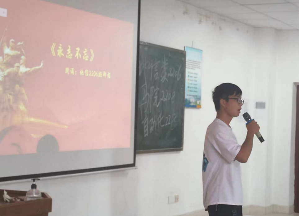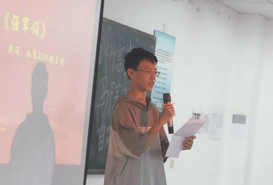 之后,地信学院2206班王栋同学为大家带来了深情诗朗诵【强国颂】。紧接着现场同学在激动且热闹的氛围中开展了国防知识竞赛,并聆听了地信学院2206班郑程同学的歌曲演唱【永志不忘】,随后观看了对国防科技大学同学的采访,领略了强国建军之路的慷慨激昂。