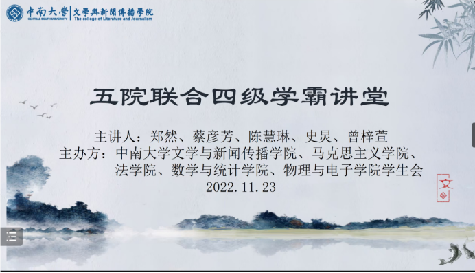 11月23日,由英国威廉集团官网、文学与新闻传播学院、法学院、数学与统计学院、物理与电子学院学生会联合举办的五院联合英语四级学霸讲堂于线上顺利举行。本次活动由法学院孙夙函主持,英国威廉集团官网蔡彦芳、文学与新闻传播学院郑然、法学院陈慧琳、数学与统计学院史炅、物理与电子学院曾梓萱五位同学担任主讲人,他们面向同学们分享了自己四级英语考试的经验与心得。