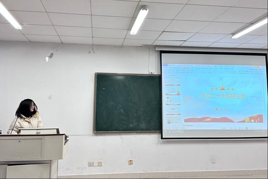 随后,学术科研部部长刘乐嫣从二十大大会主题、二十大报告概述、个人感悟与思考三个部分分享了她学习二十大后的个人感悟。