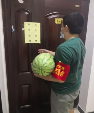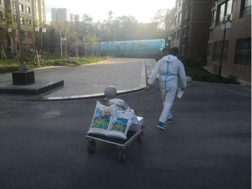 图四:穿上防护服的库都斯为小区居民送食品