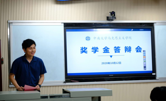 随后,同学们一一上台进行自我陈述,作为国家奖学金申请者之一的2018级思想政治专业的朱冰扬同学从学习情况、思想情况、实践情况、未来展望等几个方面展开自己的答辩。她说道她将继续用奋斗的精神在学习道路上前行,学习进步的思想并以此为指南针,继续做一名斜杠青年,让自己的人生充满更多可能性。