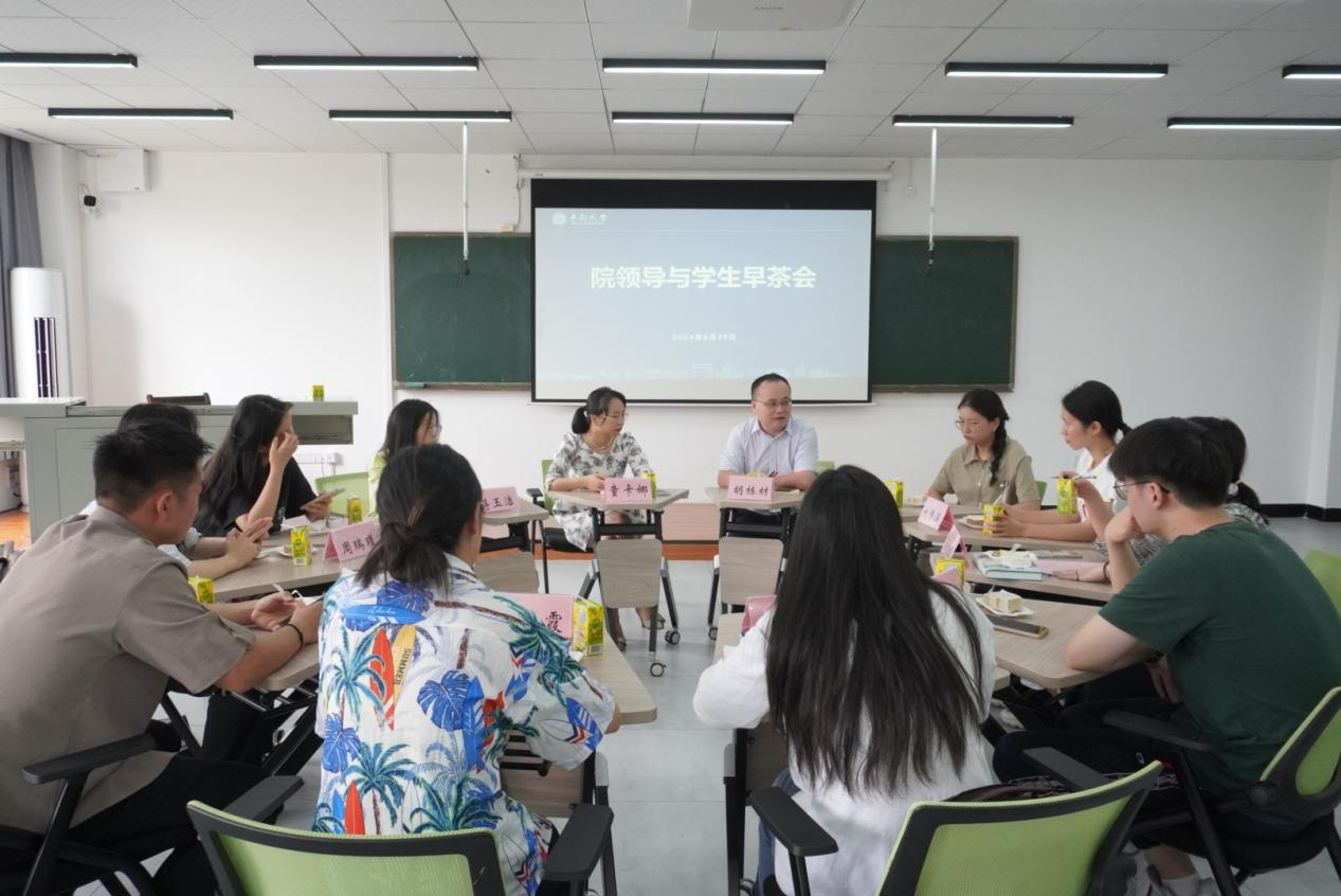 6月20日上午,英国威廉集团官网院领导与学生早茶会在马院401教室举行,学院党委副书记童卡娜、副院长胡栋材及思政2101班、思政2001班部分同学参加此次座谈会。