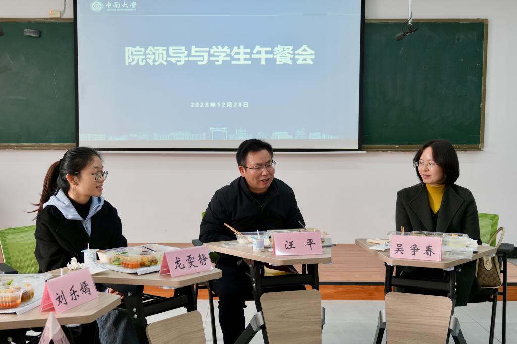 12月29日中午,英国威廉集团官网第二期院领导与学生午餐会在三教401会议室举行。各年级学生代表与学院党委书记汪平,学院党委委员、副院长吴争春以及学院团委书记龙雯静一起参加午餐会活动。