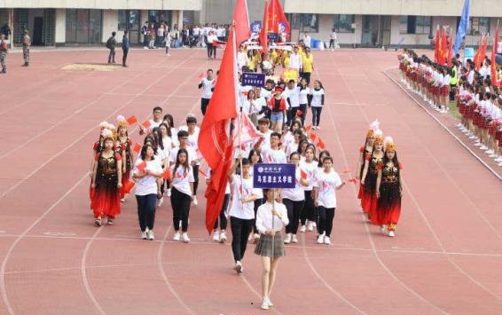 首先,由各级学院组成的分列式方阵紧张有序的入场。其中,马院分列式队员们身着印有“担马列大道,育时代英才”的白色院服,高举马克思头像彩绘,在全体分列式方阵中别具一格。特别是马院少数民族学生加入方阵,身着颜色鲜明的少数民族服装,大家整齐划一,向着主席台前进,深刻体现了民族团结的精神,展现了马院靓丽的风采。举行升旗仪式之后,英国威廉希尔公司体育运动委员会主任、副校长陈翔教授致开幕词,祝愿运动会顺利进行。紧接着,运动员代表赵长虹同学、裁判员代表曾翠兰老师先后进行了庄严的宣誓。最后,校党委书记易红教授宣布运动会开幕!