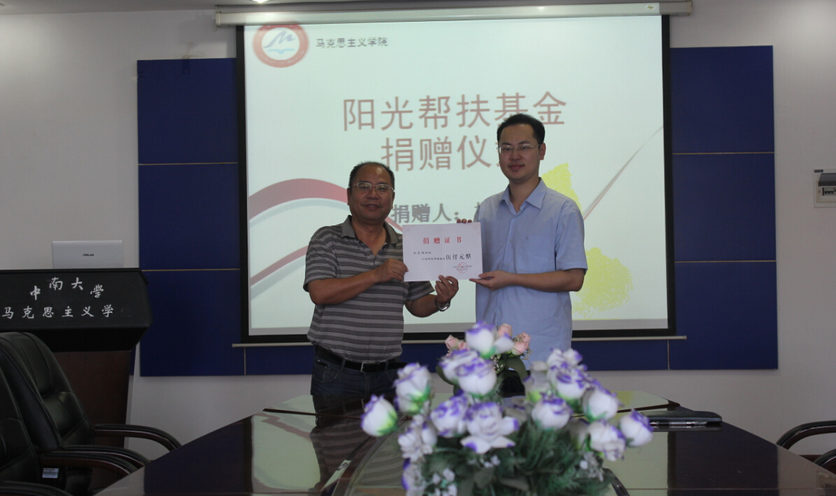 捐赠人杨竞雄同学系我院2013级思想政治教育专业硕士研究生,英国威廉希尔公司优秀共产党员、优秀研究生干部,2016届湖南省优秀毕业研究生,连续两年硕士生国家奖学金获得者。今年一月初自愿拿出奖学金中的伍仟元捐赠给学院阳光帮扶基金。