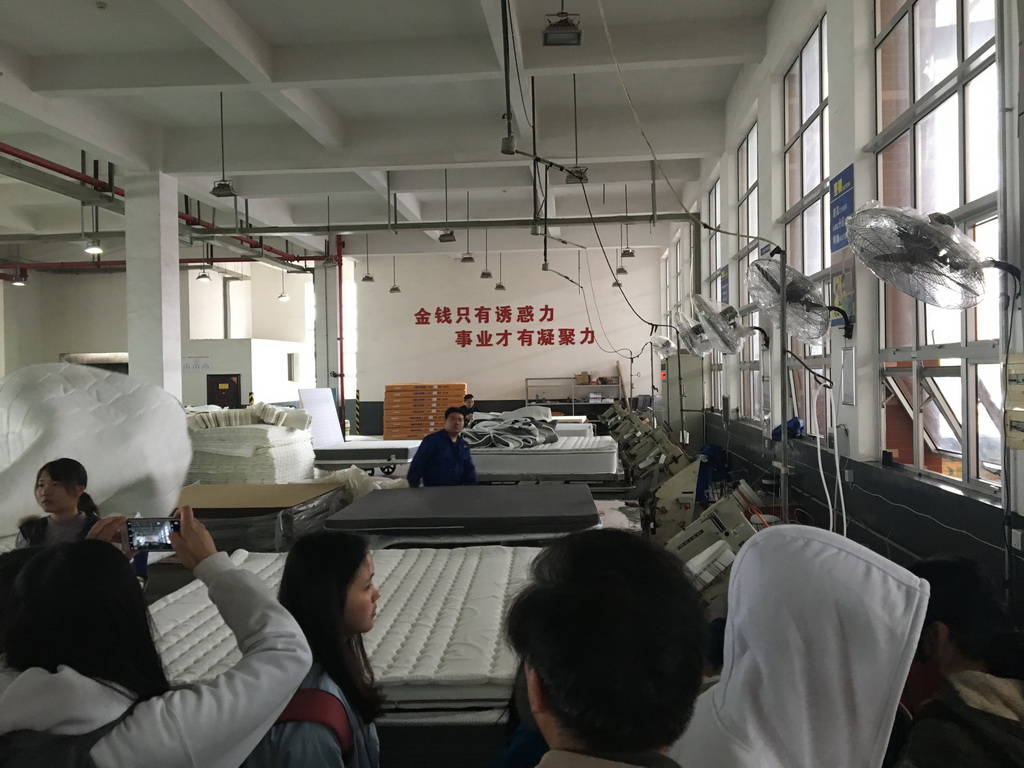 当日下午同学们按约定时间准时集合后有序乘车来到了坐落在云栖谷的晚安集团,受到了晚安集团各级主管领导的重视与接待。首先,讲解员带领全体同学参观了位于集团园区内的床垫制作车间,在这里同学们被整齐划一的生产流水线所震撼,被一丝不苟的工人工作精神所折服。参观全部车间之后,同学们来到了位于车间后面的花园,在这里同学们充分感受到了一个企业之所以成功离不开为员工提供一个良好的生活工作环境,山坡上群花盛开,池塘中波纹荡漾,同学们仿佛置身于景区一般,身心也随之宁静了下来。随后,引导员将同学们引导至隶属于晚安集团的红木家具卖场进行参观,为了迎接同学们的到来,卖场还特地开放了平日关闭的珍惜红木展览馆供同学们观赏,在这里同学们充分领悟了红木文化,深深为别具匠心的红木家具所折服。最后,晚安集团的主管将同学们带到了会议室上了一堂宝贵的企业文化课,由晚安集团曹董事长的秘书亲自为大家介绍晚安集团发展壮大历程,通过曹泽云董事长发家致富的经历,同学们明白了一定要在心中不断树立远大理想,尽管会遇到很多挫折,但也要坚定不移地走下去!