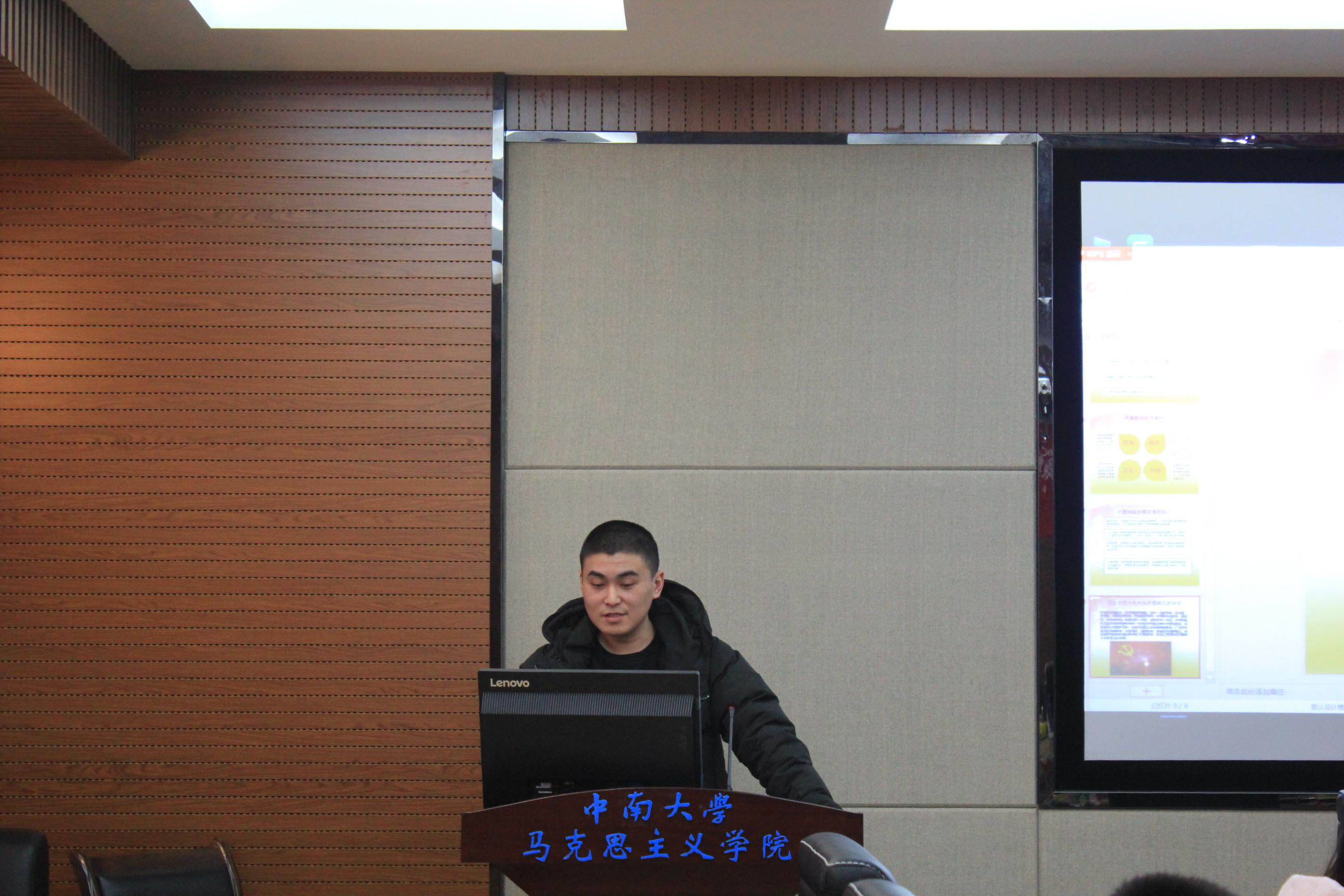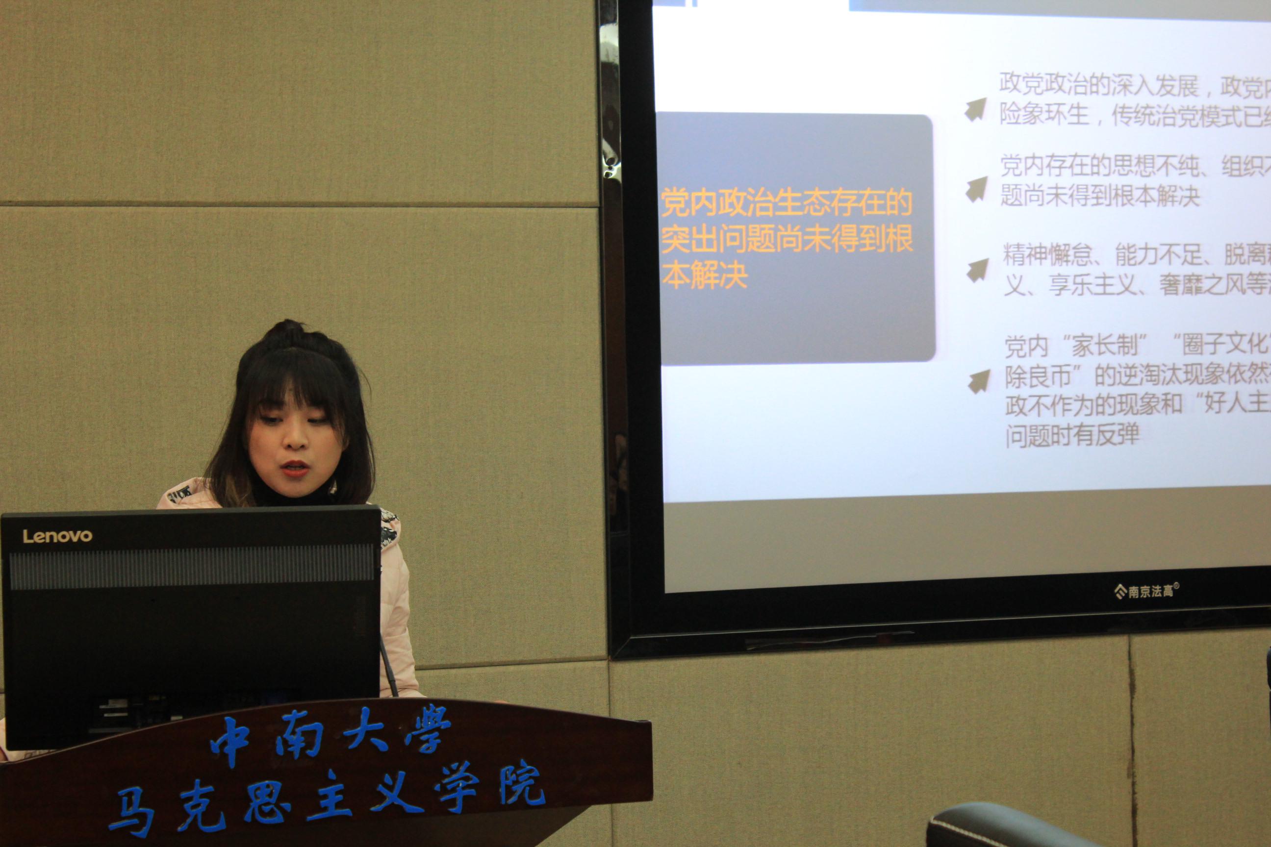 2017级狄神武则围绕新时代的主要矛盾的转变来讲解。主要从转化的历史条件、新矛盾的具体表现、矛盾解决的可能性三个方面对新时代的主要矛盾进行了解读。2017级李哲同学以从十九大看党内政治生态的净化为主题,主要分背景、理论实践、实现途径三个方面对党内政治生活的净化进行了分析。