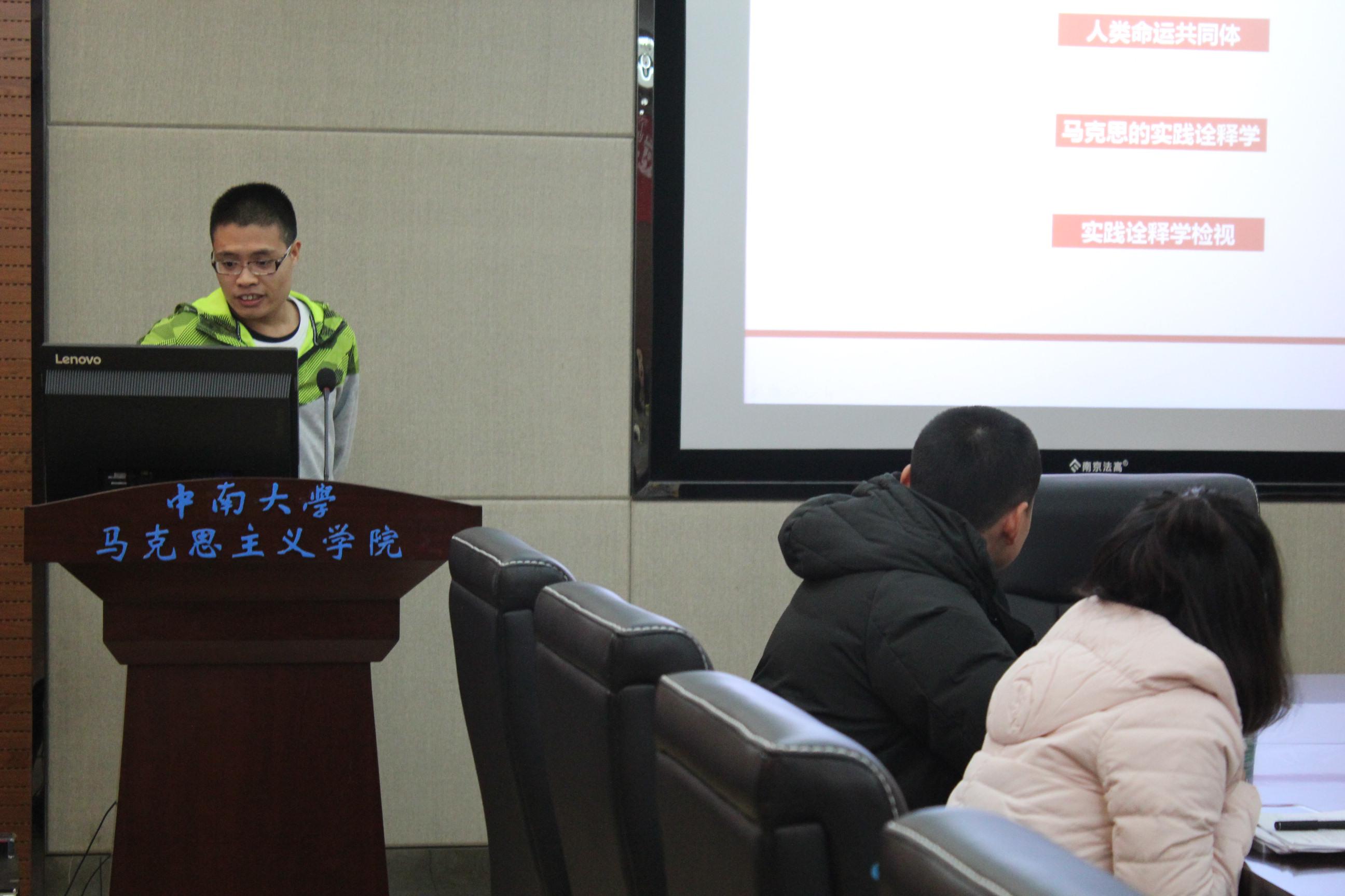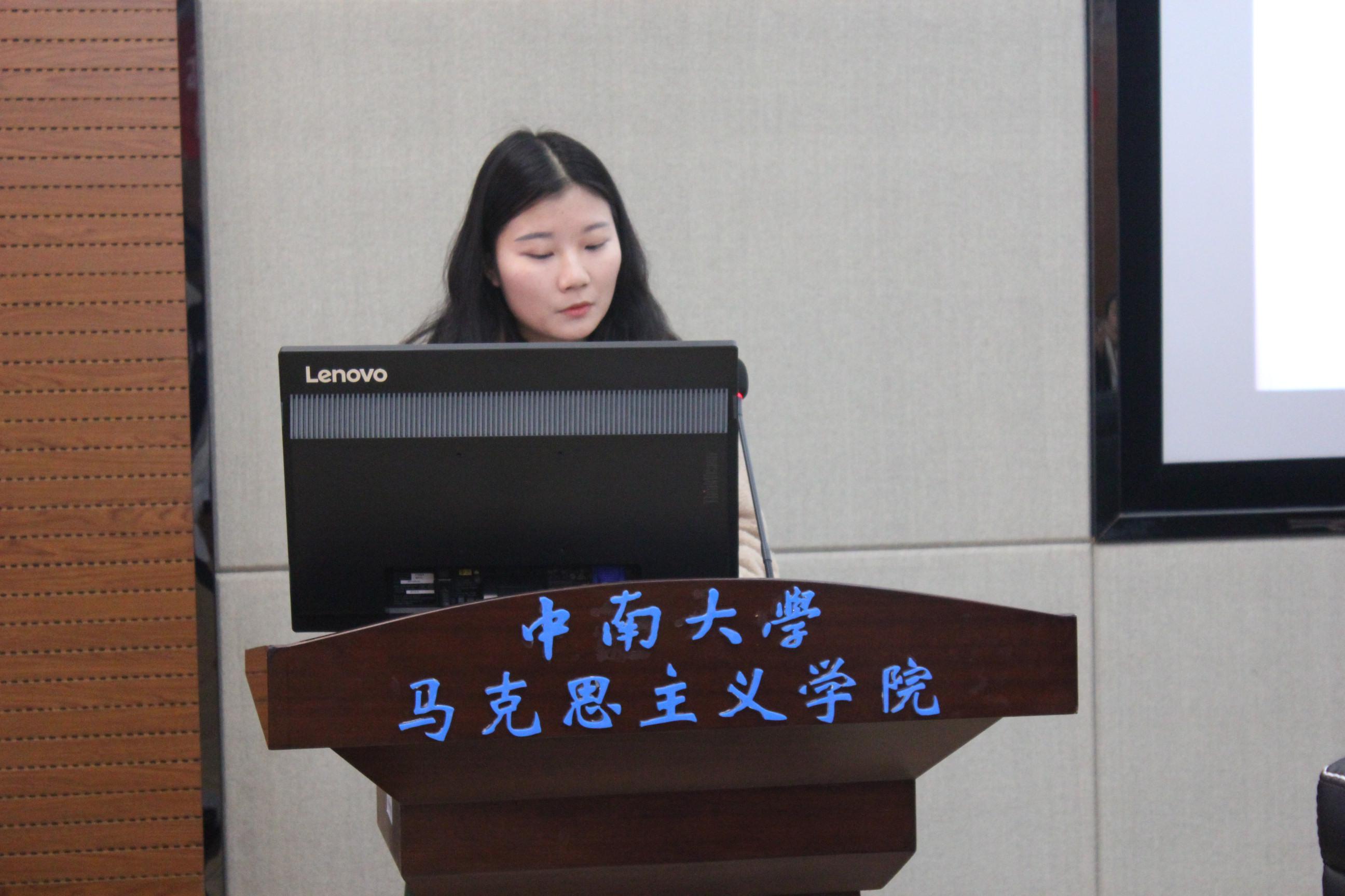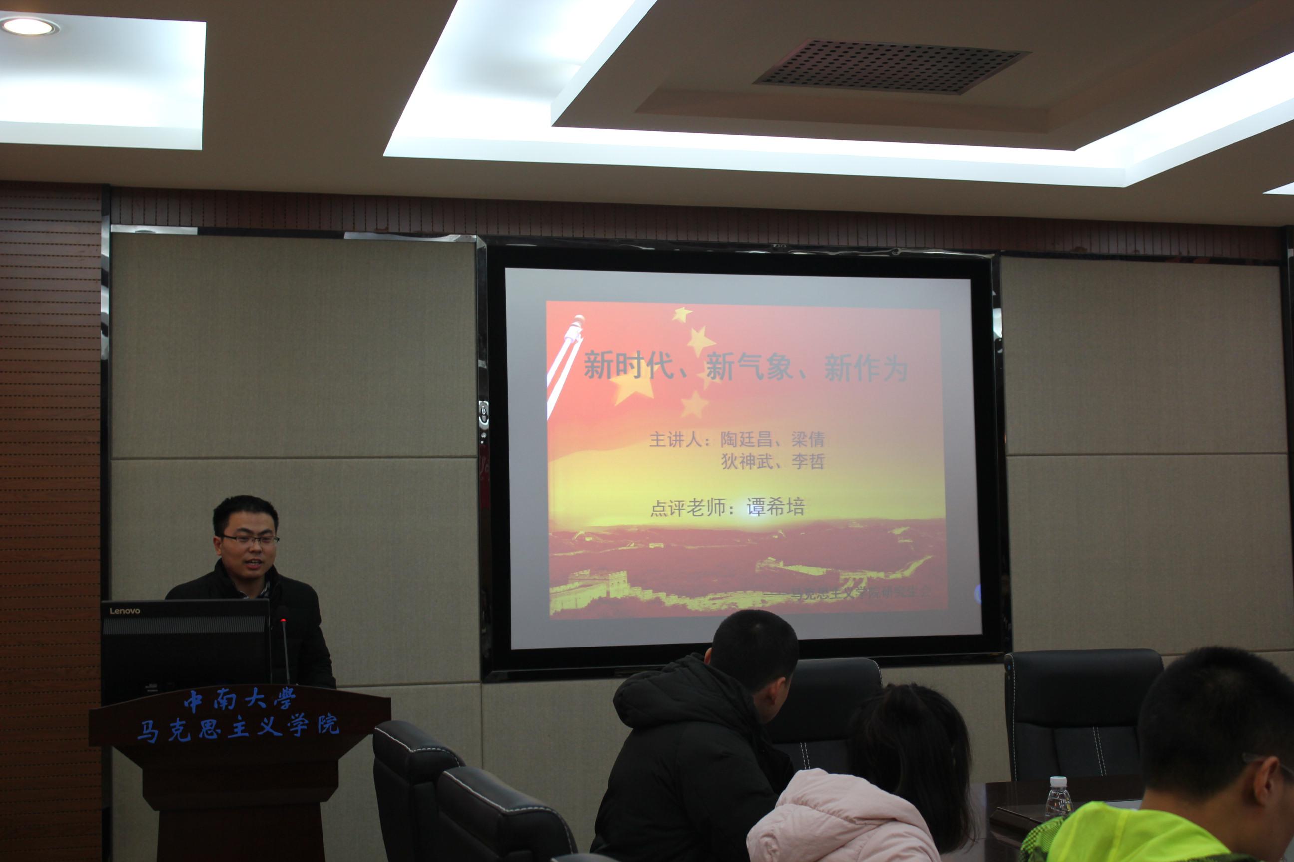 接下来四位研究生代表分别围绕十九大精神,选取某个角度来解读十九大精神。2016级梁倩以党中央的强国方略为主题,主要从党中央强国方略的内容、对之前的理论的继承以及对理论的创新性这三个方面来对党中央强国方略做了分享。2016级陶廷昌则另辟蹊径,从实践诠释学的角度对十九大报告中提到的人类命运共同体做了详细的分享。