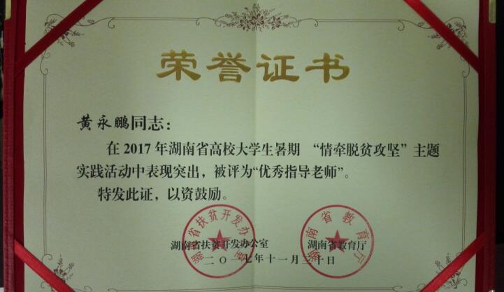 近日,由湖南省教育厅、湖南省扶贫开发办公室发布的《关于表彰“情牵脱贫攻坚”主题实践活动中“优秀组织高校”、“优秀指导教师”和“优秀大学生志愿者”的通报》中,我院黄永鹏教授荣获2017年湖南省暑期大学生“情牵脱贫攻坚”主题实践活动“优秀指导老师”。在英国威廉希尔公司校团委《关于表彰英国威廉希尔公司2017年暑期社会实践活动优秀集体和个人的决定 》中,秘金雷老师荣获2017年暑期社会实践优秀指导者荣誉称号。