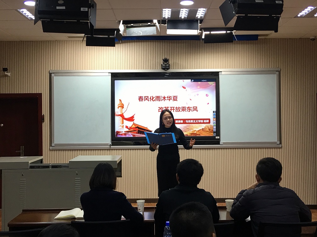 经过前期宣传,同学们积极参与此次诵读比赛。比赛选手们精心选择诵读内容,赛前认真排练,比赛如火如荼,取得了非常好的效果。其中杨柳同学的《春风化雨沐华夏 改革开放乘东风》着眼于我国改革开放取得的伟大成就及奋斗历程,观众们听后振奋人心、深受鼓舞,张望和张敏妍同学的《我的祖国》饱含深情,唤醒了在场每位听众的民族自豪感和爱国热情,谭登科和马晓艳同学的《邓小平之歌——拓荒岁月》内容深刻,歌颂了改革开放的伟大创举,同时也流露出对邓小平同志的深深思念。以及李雪梅、周鼎、赵瑾怡同学的《与祖国同行》展现了当代大学生与祖国共奋进的信念与决心。