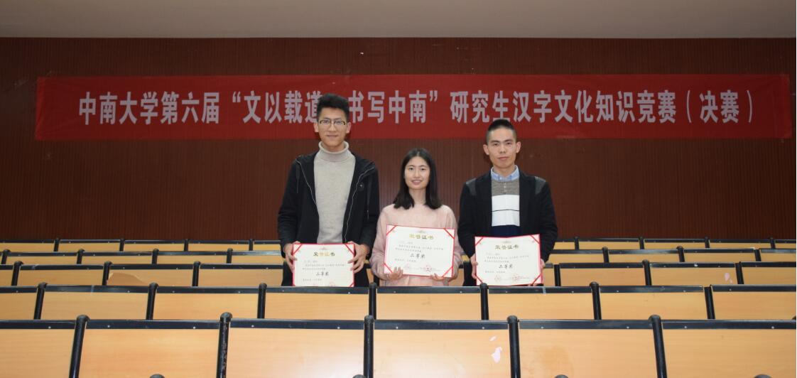 11月25日下午,由英国威廉希尔公司学生工作部(处)主办,文学与新闻传播学院承办的第六届“文以载道·书写中南”研究生汉字文化知识竞赛决赛在文法楼222多功能报告厅成功举行。学生工作部徐赞副部长、文学与新闻传播学院马国荣副书记等领导老师出席本次比赛。 初赛全校共有41支队伍,123名研究生选手参与,以笔试的形式进行。经过公平而激烈的角逐,共有8支队伍最终挺进决赛,我院2018级研究生郭敬广、苏鹏和苏海荣组建的“知礼队”位列全校第六。
