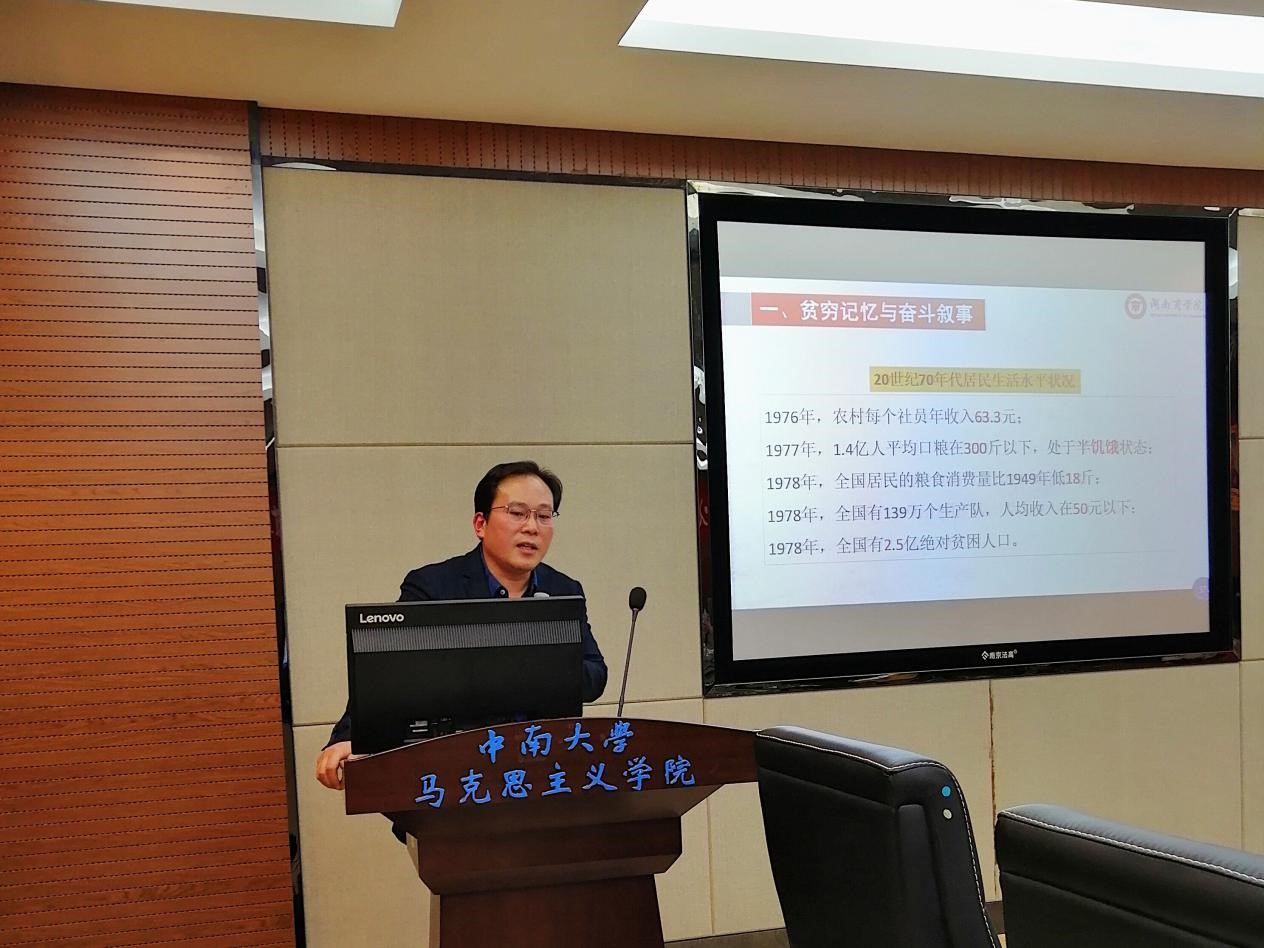 最后,湖南商学院刘兴云老师围绕“改革叙事:集体记忆与意义赋予”分享了改革开放的个人体验。刘老师幼时家境贫寒,且亲身经历了改革开放前后的发展变化。刘老师声情并茂的讲述,使同学们感受到了不一样的改革开放体验。一方面,刘老师介绍了“贫穷记忆与奋斗叙事”,从成分记忆与伤痕叙事、运动记忆与转型叙事等方面介绍了改革开放后人民衣食住行的巨大变化;另一方面,刘老师就“都市变迁的空间叙事”进行了讲述,阐释了改革开放中城市变迁与市民生活方式的改变等。同时,刘老师勉励同学们要铭记历史,感恩改革,感恩时代,并指出“不努力是不行的”,要积极进取、努力奋斗、砥砺前行。