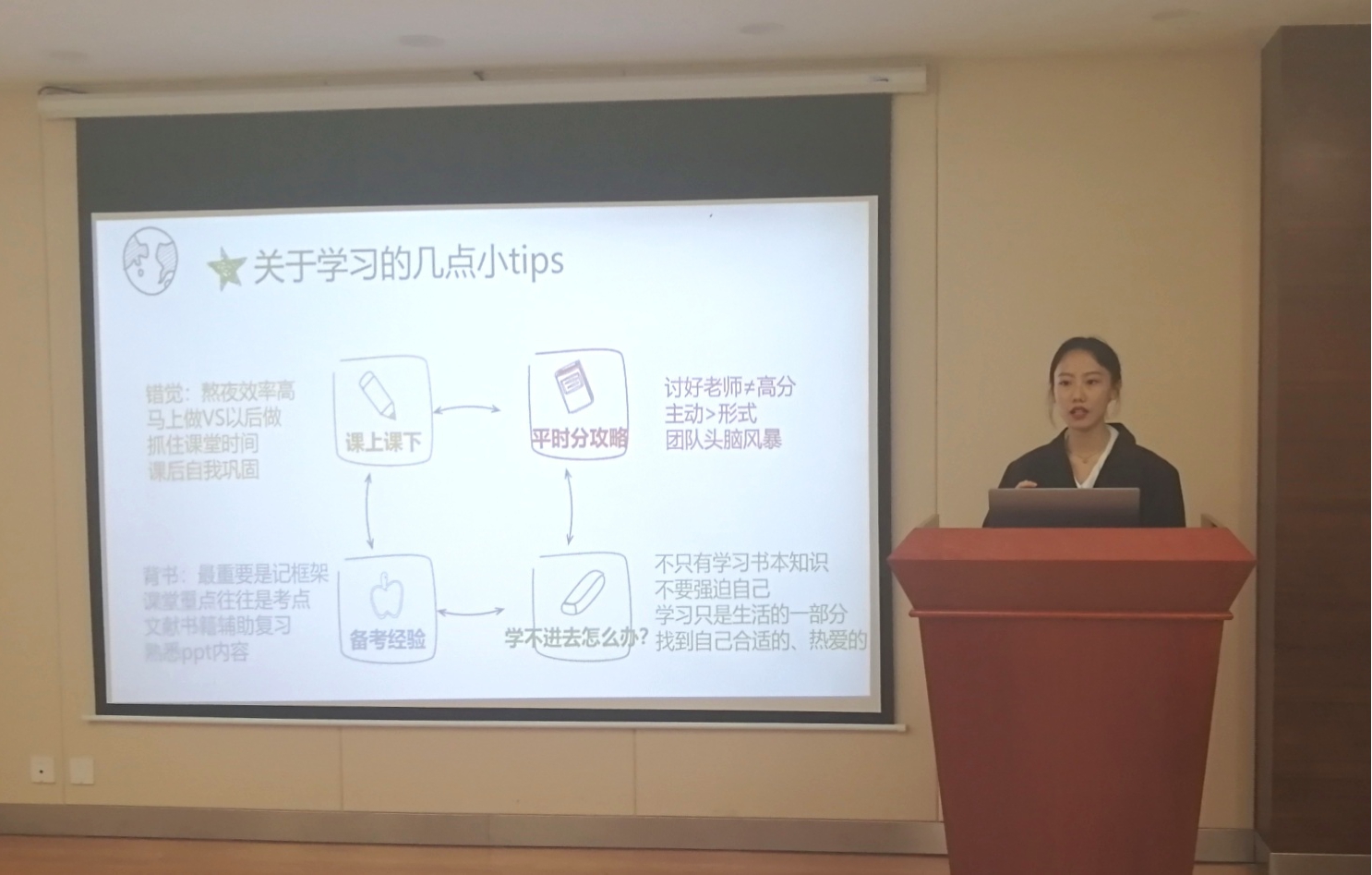 接下来,本科生濮瑞恬则就学习情况、学生工作、课题竞赛、社会实践四个方面展开。她讲述,学习和课余活动需协调并重。为使自己全面发展,应积极参加课外研究、学会团队合作、与老师和谐相处、积累考试经验、积极参与创新创业竞赛。她还针对同学们在不同时期的困惑和迷茫,提出了相关看法和建议,重点强调了兴趣对于学习的重要性。她着重介绍了自己的经验和独特的学习方法,希望发挥自己所长,多为大家提供帮助。此外,她通过自己的竞赛经验和实习经验,鼓励大家有选择地参与课外研究课题,希望大家能一直有勇气去追寻自己感兴趣的事,坚持走下去。问答环节中,濮瑞恬回答了同学关于学术研究的经验积累以及竞赛消息的获取问题,分享了自己的消息来源,同时就之前分享中提到的数学建模竞赛介绍了自己的灵感来源。