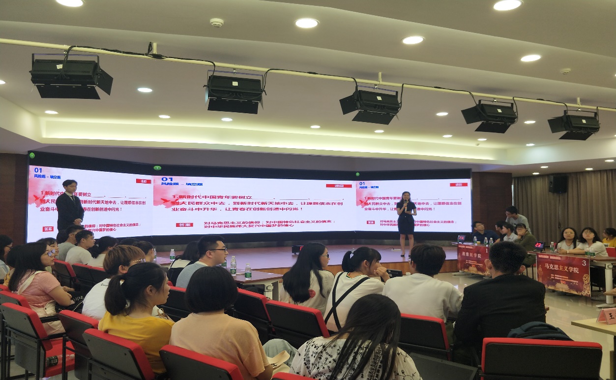 参赛队伍来自六个学院,各代表队由四名成员组成,共24人参赛。决赛分为必答题、抢答题、风险题和加时赛四个部分。首先是必答题环节,各学院选手按照初赛排名依此轮流作答。参赛队伍们都表现出了丰厚的知识底蕴,胜负难分;接着是抢答题部分,有的队伍反应灵敏,作答准确,也有的队伍出现了失误,队伍之间的分数悄然拉开差距,比赛迎来了一次高潮;最后是风险题部分,每支队伍拿出看家本领,各显神通。