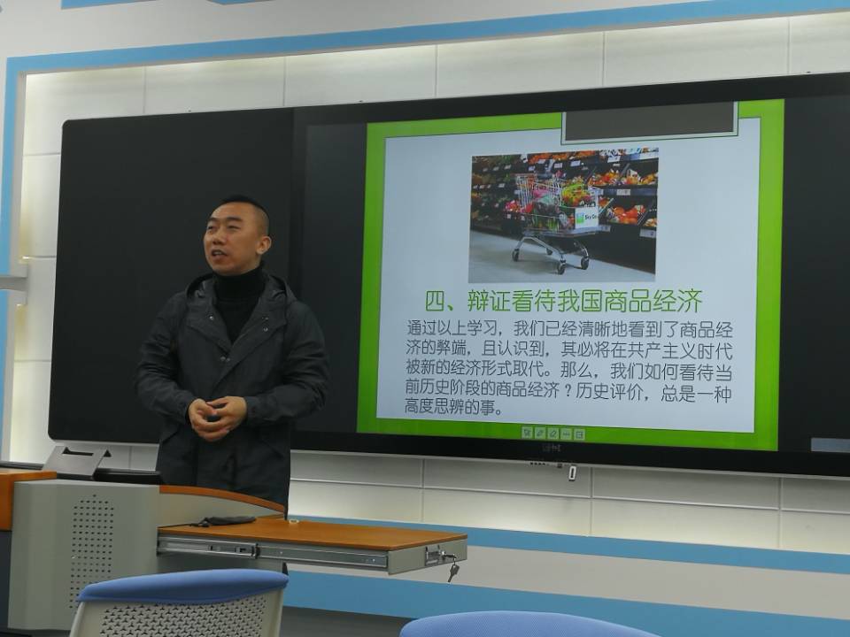 刘临达老师以“辩证看待我国商品经济”为题,现场呈现了其平常上课时的知识布局、逻辑结构与讲授风格。他从归纳国内学界对商品经济的不同观点入手,再结合国内市场出现的典型商品经济案例,引出商品拜物教、共产主义与交换价值、卡夫丁峡谷、劳动二重性等“马克思主义基本原理概论”课程中所涉的重要概念,继而再以党和国家领导人关于商品经济的重要论述来升华主题。整个讲授过程自然流畅、知识呈现立体饱满、逻辑结构严密有序。