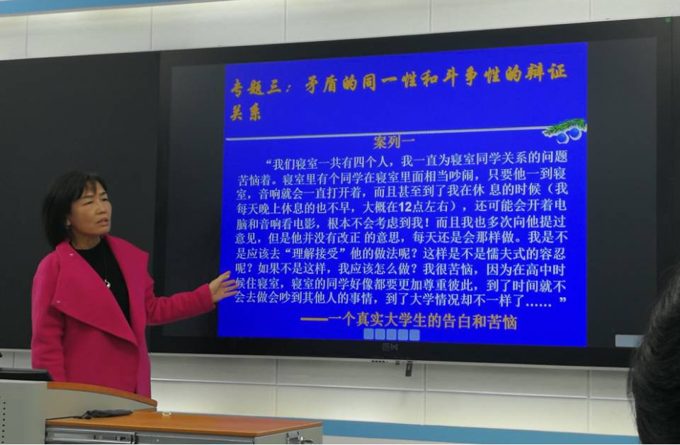 曹骞老师以“矛盾的同一性和斗争性的辩证关系原理及方法论意义”为题,澄清学界极容易误解误用的矛盾概念。她以所授班级学生给她所写的“人际关系苦恼信”为切口,将“大学生该如何处理同学之间的关系”这一日常生活议题引入到矛盾概念的哲学论证领域。她扎实辨析矛盾同一性和斗争性的科学内涵,以及二者的联结原理,最终落脚于“异中之同”和“同中之异”,革新发展了学界对于矛盾概念的既有分析范式。她的理解有深度,讲授有温度。