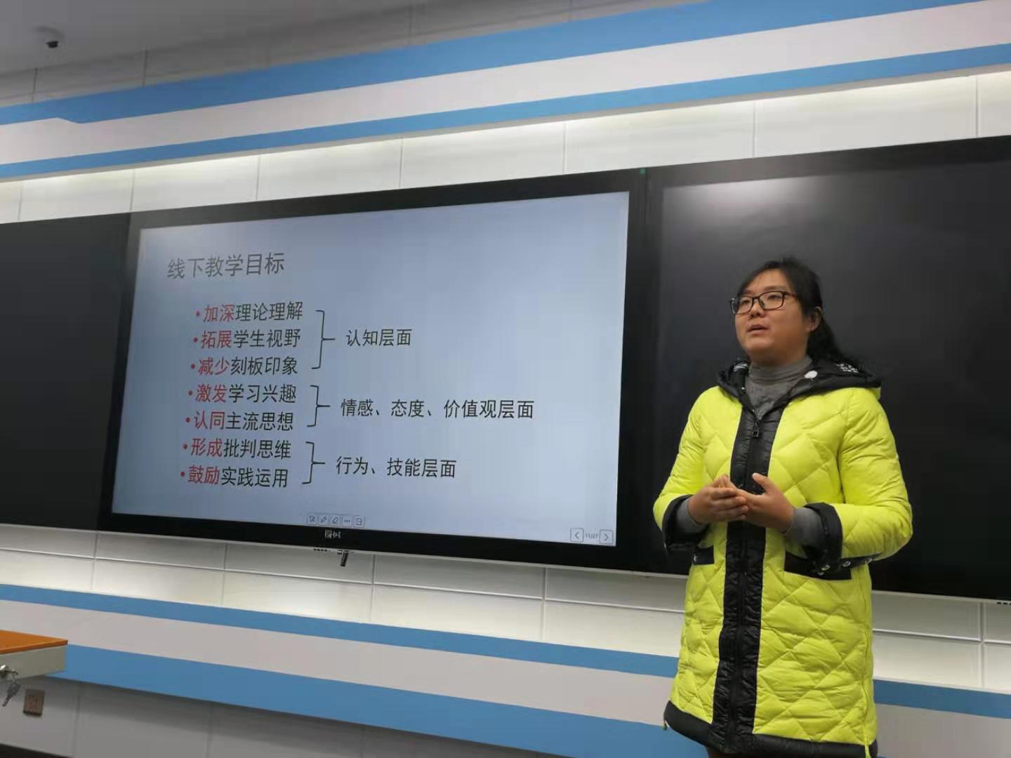 季娇老师以“线上线下教学有效结合专题分享”为题,重点针对线下教学、结合四年的教学实践经历进行分析。她从用户需求和供方特点的视角分析了学生特征和任课教师自身特色,在教学目标上从认知层面、情感态度价值观层面和技能层面进行有针对性的重新定位。她提出,通过线下教学,希望学生能够加深理论理解、拓展学生视野、减少刻板印象、激发学生学习兴趣、认同主流价值观、形成批判思维能力、鼓励实践运用。最后,季娇老师以“爱国主义的内涵”为例,结合她的教学理念进行说课,展示了线下教学和线上教学的有效结合。