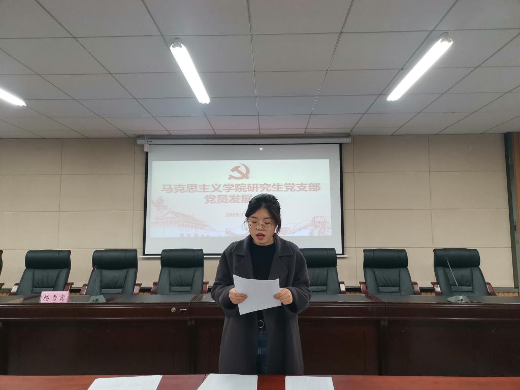 为更好地吸收新党员、为党注入新鲜血液,推进党的基层组织建设。12月5日晚七点,马院研究生党支部于会议室407召开党员发展大会。学院党委副书记杨雪宾及研究生党员、预备党员参加此次会议。会议由支部副书记张维超主持。