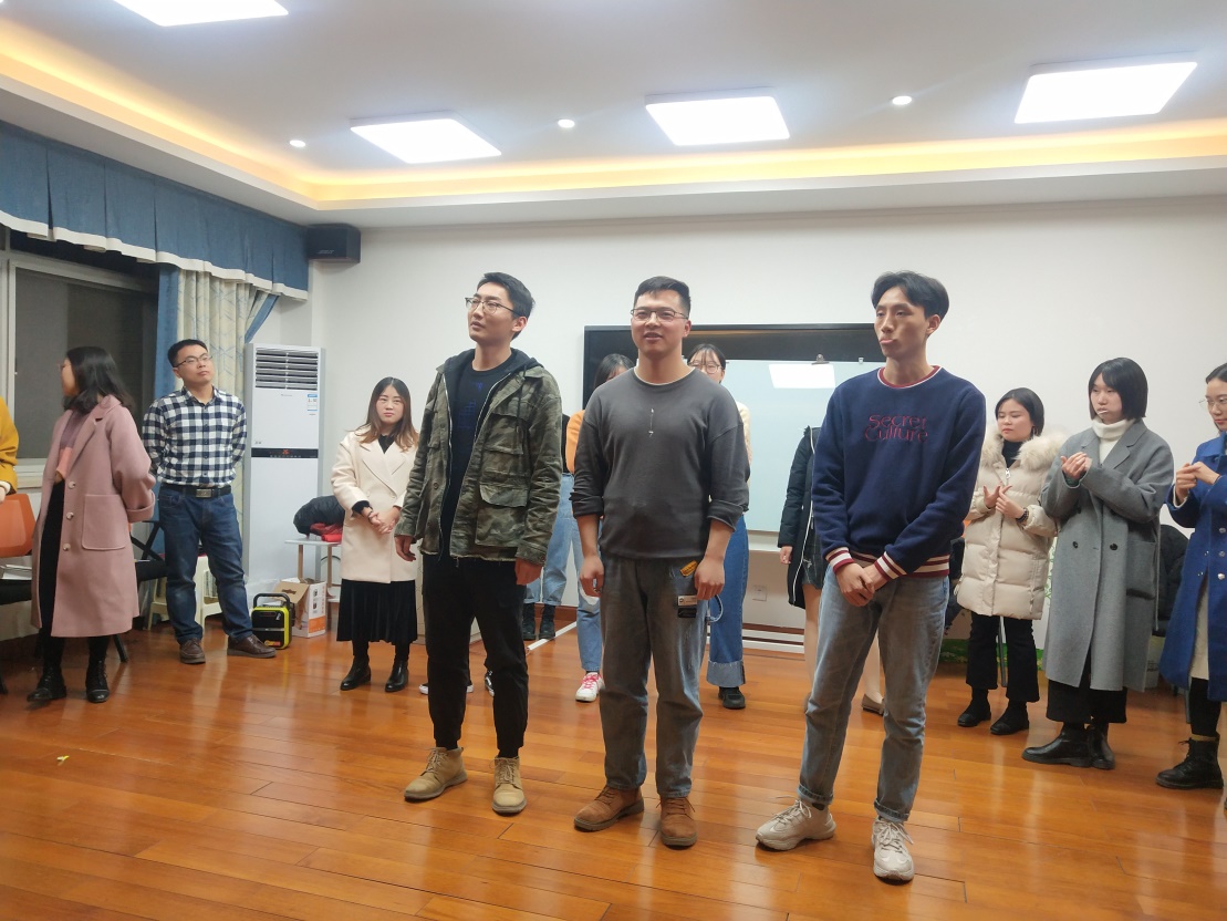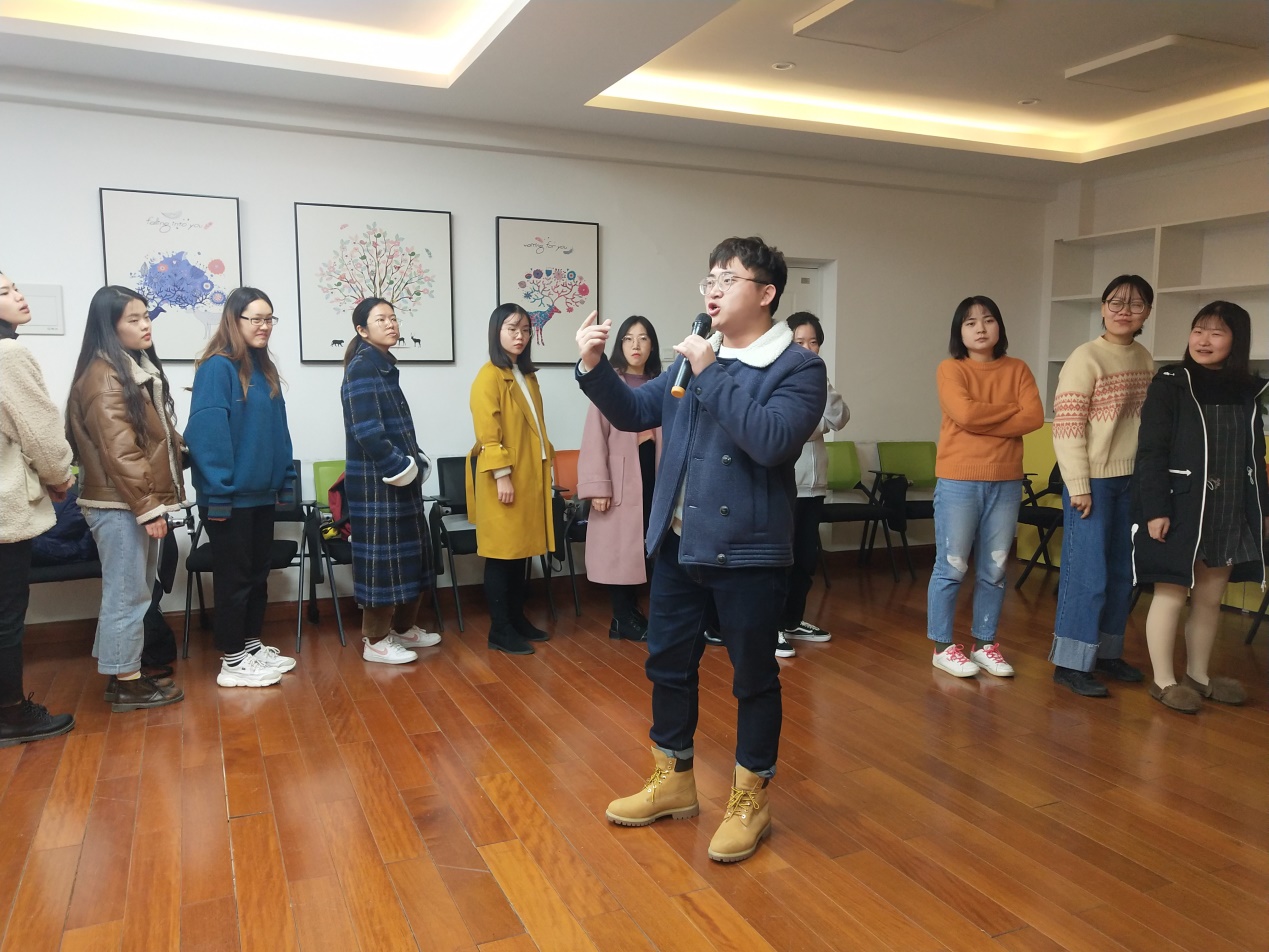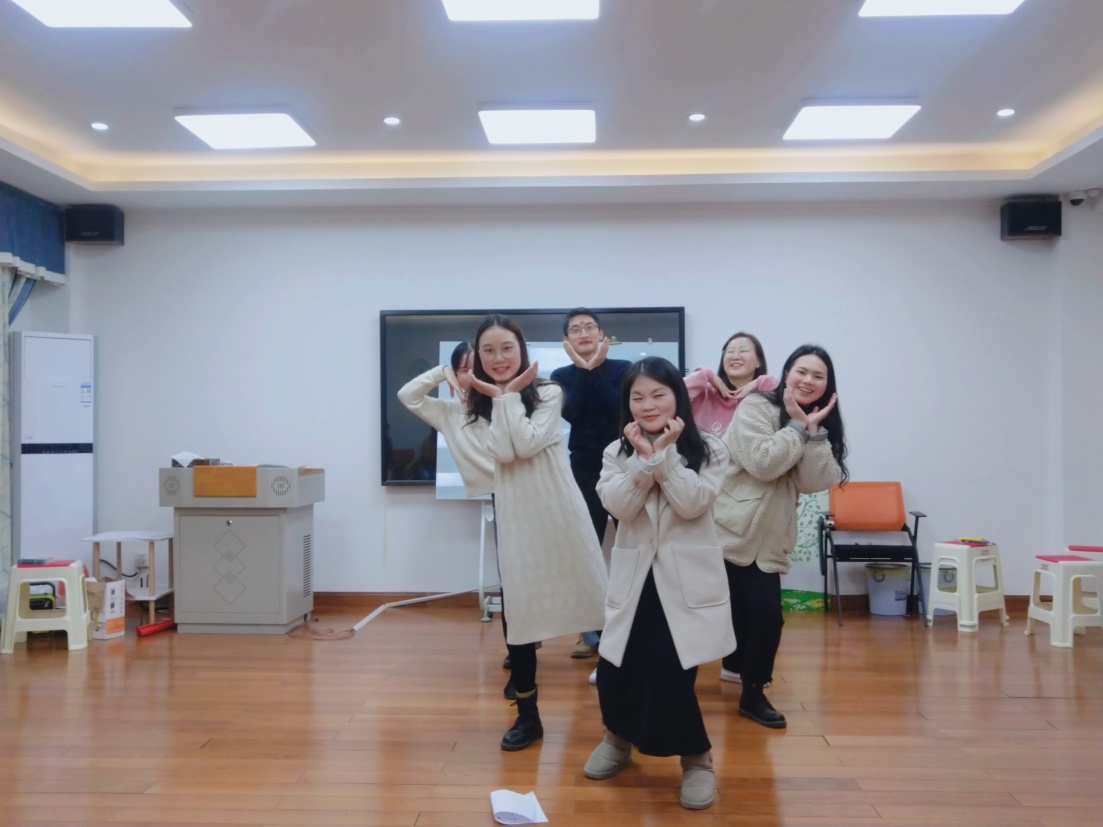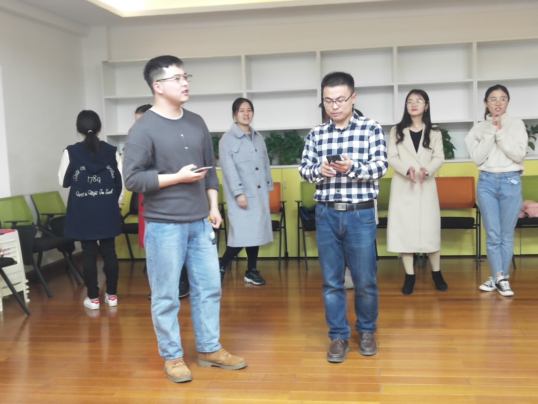 活动第一个环节,同学们围成一个圈跟随音乐律动进行跑动,音乐停止时迅速按老师说出的数字进行抱团,落单者出局,游戏极大地调动了同学们的情绪。在惩罚环节,李恒、焦鑫和张维超同学以及秘金雷老师一展才艺,为大家带来了歌曲表演和原创诗朗诵,获得同学们的阵阵欢呼。