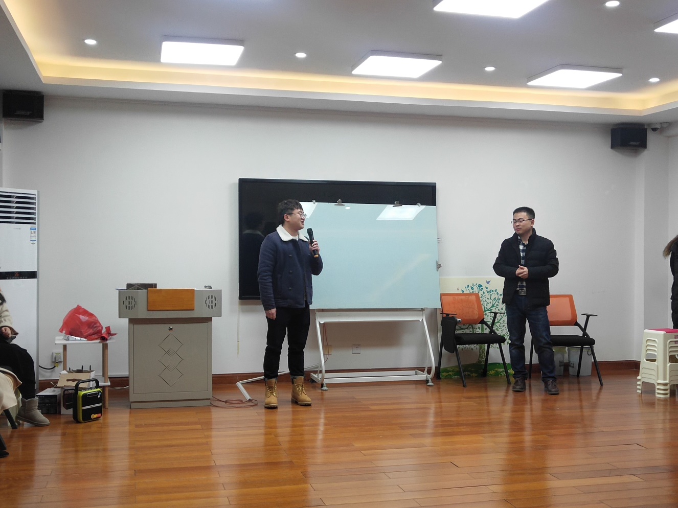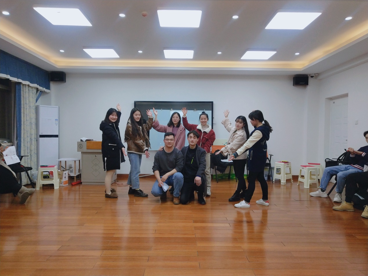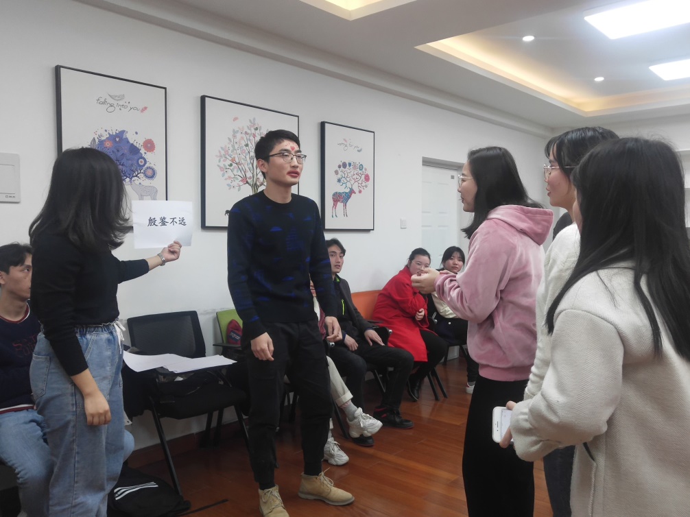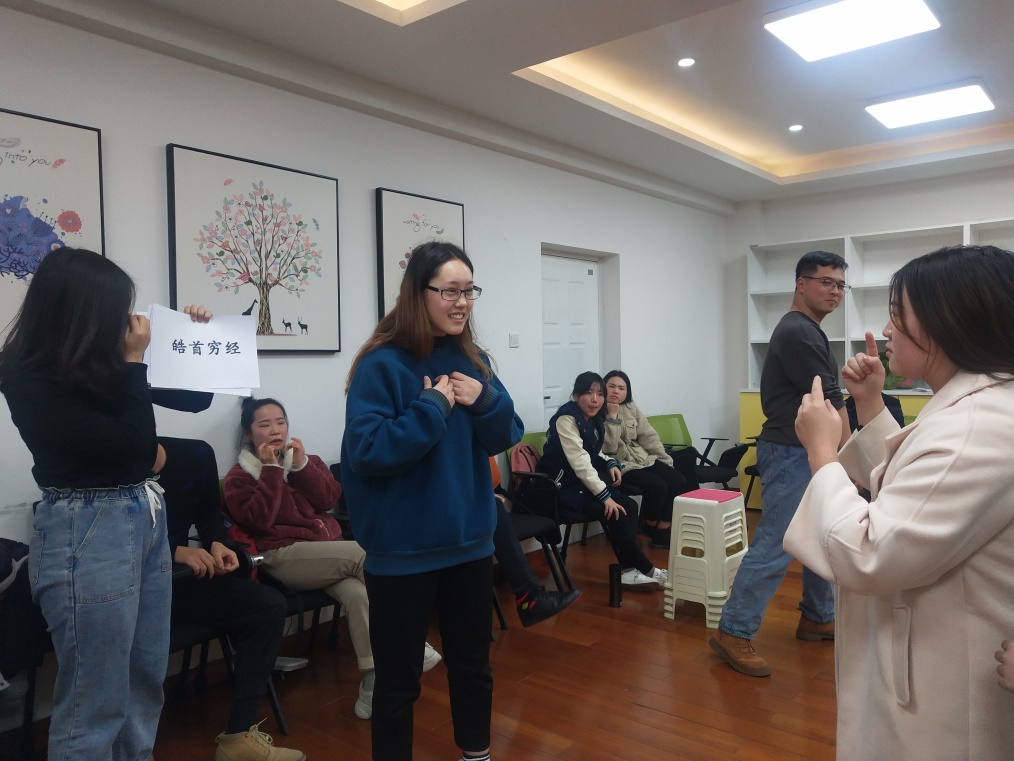 活动第一个环节,同学们围成一个圈跟随音乐律动进行跑动,音乐停止时迅速按老师说出的数字进行抱团,落单者出局,游戏极大地调动了同学们的情绪。在惩罚环节,李恒、焦鑫和张维超同学以及秘金雷老师一展才艺,为大家带来了歌曲表演和原创诗朗诵,获得同学们的阵阵欢呼。