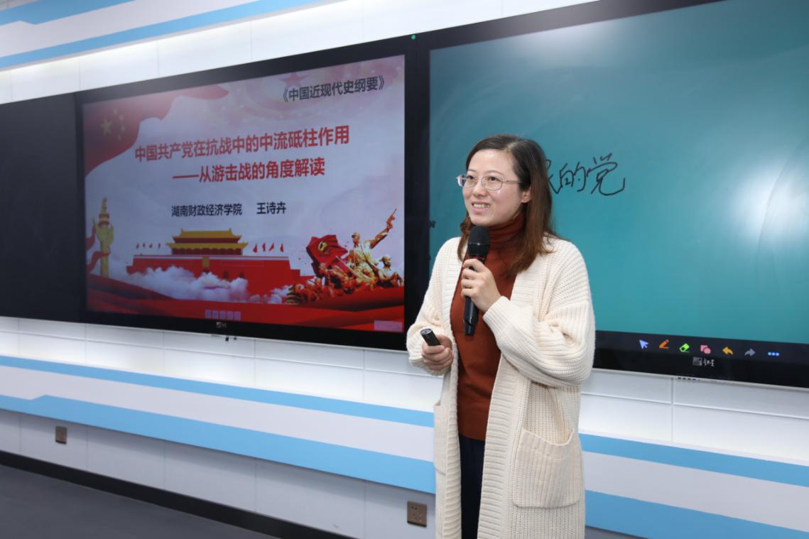 此次年会还邀请了2019年荣获教育部思政课教学竞赛一等奖和二等奖的三位优秀青年教师进行现场说课、教学展示和参赛经验介绍。湘潭大学的熊慧老师以《世界观望中国,我们凭什么自信?》为题,从站起来、富起来和强起来三个方面回顾了中国近代以来的发展历程,展示了思政课教师的信仰和情怀,立意深远,史料详实,富有说服力。湖南财政经济学院的王诗卉老师从游击战的角度解读中国共产党在抗战中的中流砥柱作用,娓娓道来,说理透彻,生动活泼。湖南第一师范学院的谭凯老师结合自身经历分享了参加教育部思政课教学竞赛的心得、体会和相关技巧,并介绍了国内名校参赛的有关经验,让在场的与会代表直呼“脑洞大开”。我院充分利用智慧教室,联合湖南超星公司,对三位优秀青年教师的教学展示进行了现场直播,与未能亲临现场的全省“纲要”课教师分享了精彩的教学展示活动。