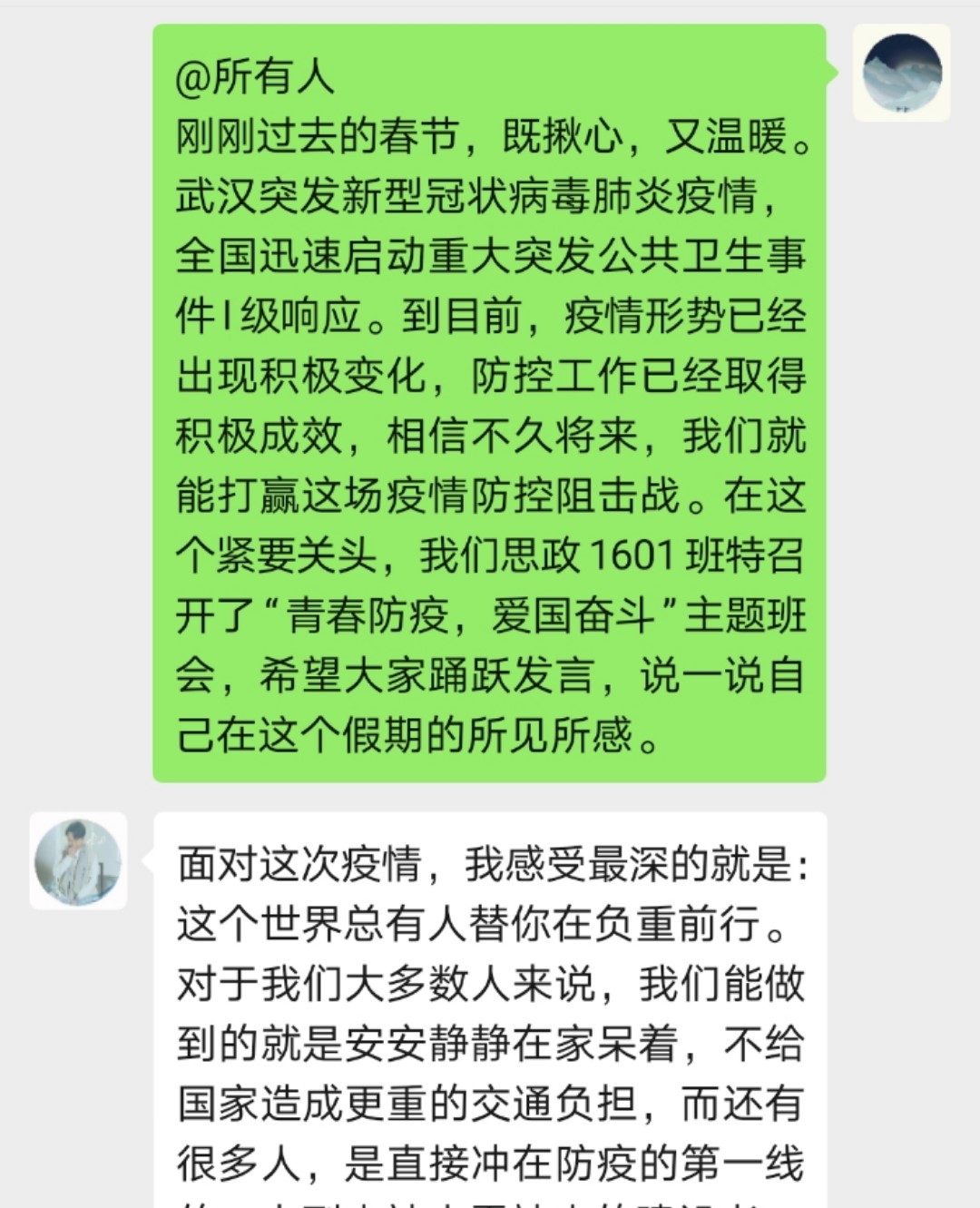 刚刚过去的春节,既揪心,又温暖。武汉突发新型冠状病毒肺炎疫情,全国迅速启动重大突发公共卫生事件I级响应。到目前,疫情形势已经出现积极变化,防控工作已经取得积极成效,相信不久将来,就能打赢这场疫情防控阻击战。在这个紧要关头,思政1601班响应学校号召,于2月27日通过在班群轮流发言的形式,召开了“青春防疫,爱国奋斗”线上主题班会。大家都踊跃发言,一同分享了自己在这个假期的所见所感。