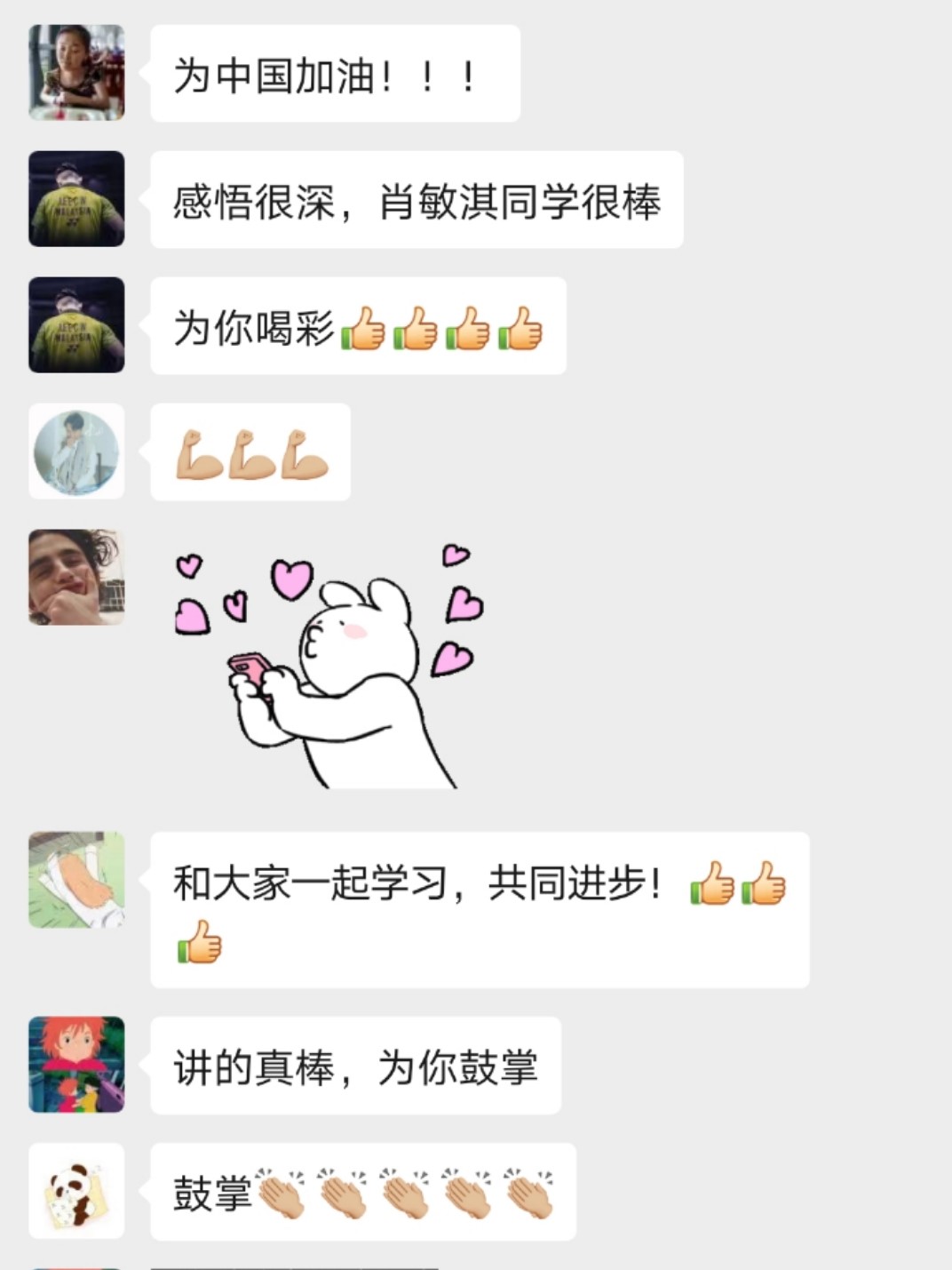 马智友同学则分享了武汉市武昌医院刘智明院长的伟大事迹,说作为党员同志,向他看齐,向他致敬;马润芃同学提醒大家理性看待网络中所传播的各种消息,并主动制止谣言的捏造,终止谣言的传播,这是每一个人的责任,盛薛琼同学也表示作为一名普通百姓,在无法像医护人员在一线抗击疫情时,所要做的就是管理好自我,可以利用更长的假期陪伴家人,也可以静下来读书充实自己,这就是我们在疫情来临时的责任,也是爱国的表现;刘洋同学发现一些外媒别有用心地利用这次疫情抹黑中国,概括到“中国犯了这个大错”,只直接把矛头指向中国而不是全面认识这个事件本身,其实质就是想要丑化中国,因此,这亟需我们在国际舆论场上及时发声,与居心叵测的抹黑言论斗争到底。