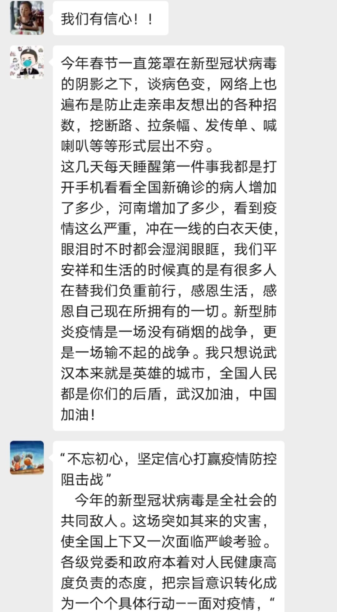 在热烈的讨论中,大家纷纷表示,虽然2020年开局给了整个社会重重一击,更应该怀抱对生活的渴望,有党中央坚强领导,举国上下同心同德,打赢疫情防控阻击战就有最大底气。在疫情面前,作为青年大学生要不恐慌、不传谣,保持信心,做好防护,在此基础上力所能及的去帮助更多的人!不获全胜,决不轻言成功!为武汉加油,为中国加油!