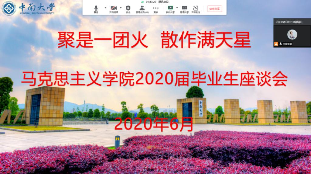 杨书记为本次座谈会致辞。杨书记向2020届全体毕业生表示祝贺,向同学们的未来表达了良好的祝愿。由于新冠疫情的原因,本次座谈会通过腾讯会议的方式进行,希望同学们珍惜此次机会畅所欲言,并再三嘱咐同学们在返校的路途中要做好个人防护,返校后严格遵守学校相关防控要求和纪律。