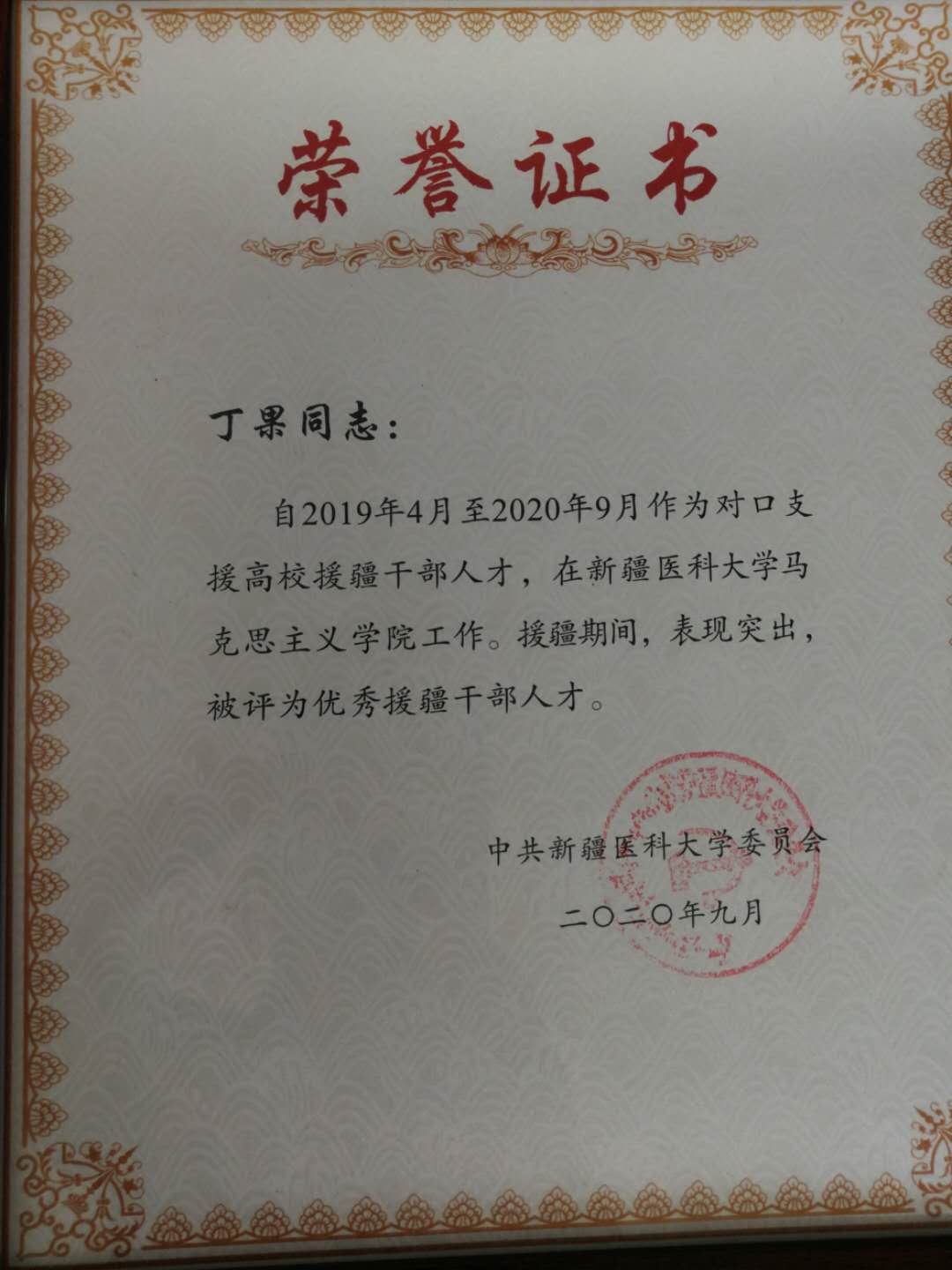 援疆期间,丁果老师担任新疆医科大学英国威廉集团官网副院长,分管学院教学业务,负责教学改革、教学督导、新进教师培养、对口支援对接等工作,全面参与学院科研、学科建设、管理等工作。他感慨说道:“最大的感受就是时间不够用,从白天到晚上,手机从不关机,睡觉从不敢深睡,这就是乌鲁木齐版的长安十二时辰。”在他的努力下,一年半时间内新疆医科大学英国威廉集团官网先后举办了5场教学竞赛、10场会议讲座,打造出“苏园里的思政课”等3个特色教改品牌,校际教学合作质量有了显著增强,青年教师教研水平有了较大提升,为新疆医科大学思想政治理论课主渠道建设作出了突出贡献。