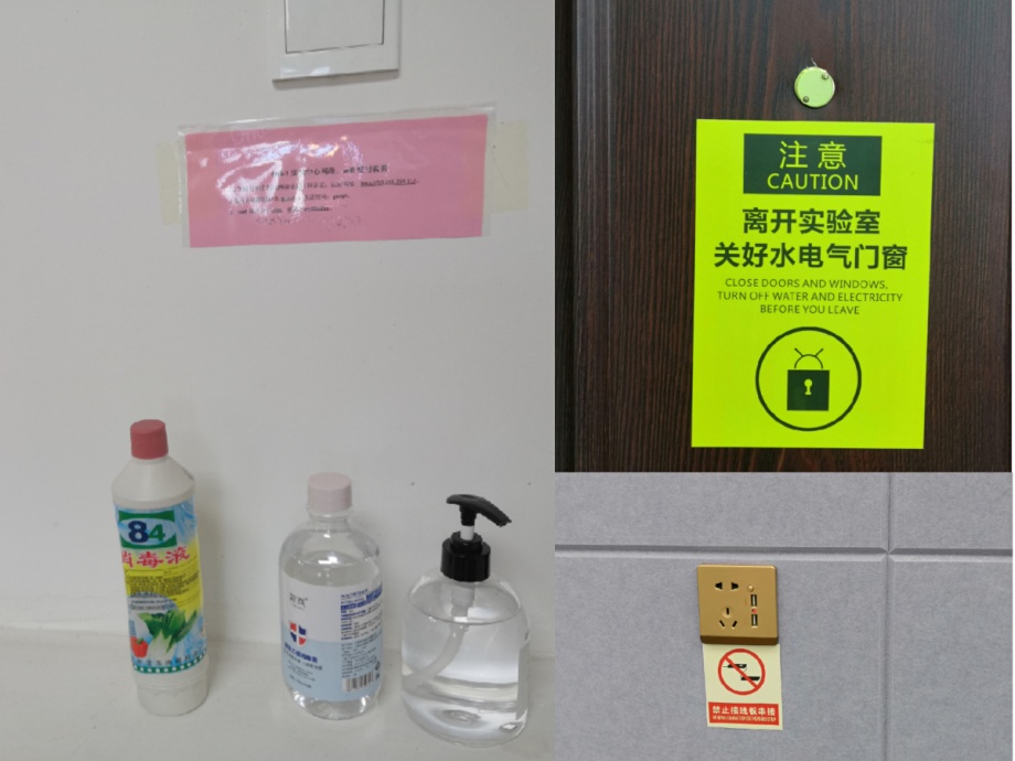 图二:实验室、智慧教室的安全标识、疫情期间的消毒物品。