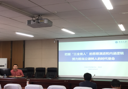 李书记指出,立德树人不仅是对中国优秀传统德育文化的传承和弘扬 ,也是对马克思人学理论的借鉴与创新,更是对新中国成立以来党的德育思想的继承和发展。立德树人教育方针即德育发展方针的提出、确立与实施经历了漫长的发展过程。李书记从萌芽期、探索期、发展完善期、开拓创新期四个时期为大家讲述了“三全育人”的具体历史脉络,他还从宏观、中观、微观三个层面细致描述了“三全育人”的内涵逻辑,指出“三全育人”的“三全”具体是指全员育人、全过程育人、全方位育人,同时李书记还强调这三者之间的逻辑关系,指出“三全育人”是新形势下围绕立德树人这一中心,按照育人主体、育人时间、育人空间这三个维度构建起来的新的德育格局和育人模式。这三者相互支撑,共同建构出思想政治工作协调发展、可持续发展的稳定结构,同时提到其主要目标就是以“三全育人”综合改革释放“大思政”综合效应,一体化构建内容完善、标准健全、运行科学、保障有力、成效显著的高校思想政治工作质量体系,破解高校思想政治工作不平衡不充分问题,形成“时时有育人、处处有育人、事事有育人”的良好局面和强大育人合力。