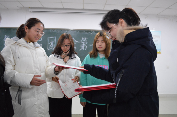 会上,主席宣布各干事正式通过实习期,由各部门部长为本部门干事颁发聘书与工作证并合影留念。