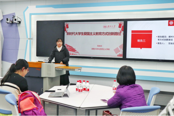 随后,青年教师林洁从形象教学出发谈爱国主义教育的影响,启迪教师在教学中要善于运用语象、物象、图像、意象,灵活生动、循序渐进地进行爱国主义教育。胡文根以“‘祖国母亲’背后的爱国政治隐喻与意识形态主张”为题,生动形象地介绍了祖国母亲喻体转型两阶段及其与共产主义的对立统一。季娇以“后战争时代下儿童对民族创伤历史的觉知”为题,介绍并分析了以博物馆为代表的社会公共教育资源在爱国主义教育中的作用。