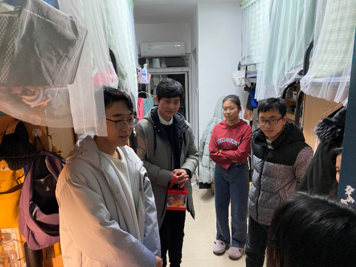 首先来到是升华学生公寓20栋的七间女生寝室。班导师李老师和辅导员陈老师依次对每一间寝室进行探访,询问同学们期末复习情况。两位老师从同学们对大学生活的期望和憧憬出发,引导每一位同学要确定一个符合实际的总体目标、要制定一个切实可行的个人计划、要做出一系列实实在在的行动;希望每一位同学通过自己的努力,能够获得一份满意的成绩。在整个过程中,老师们深切表达了对同学们的关心并且给每一位同学都带来了惊喜大礼包。