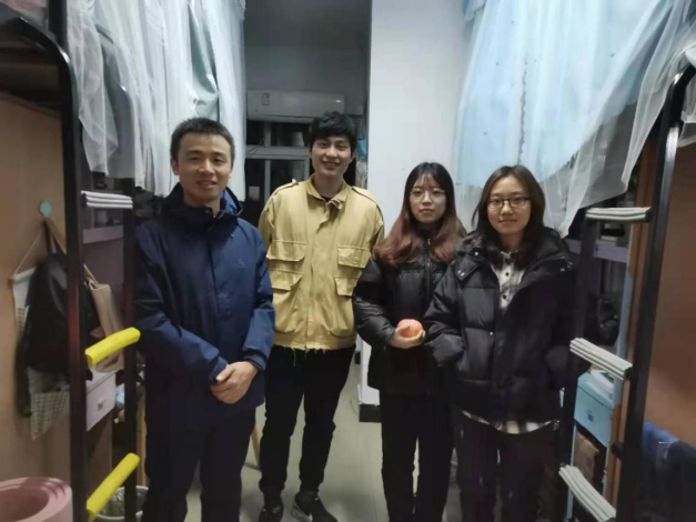 刘老师和陈老师首先来到的是升华公寓20栋的女生寝室。看到同学们在努力复习的场景,两位老师是非常满意的。两位老师提到了大学努力学习的重要性,引导同学们找到自己的一个切合实际的目标,订立切实可行的计划,并加以实施。对于期末复习也要稳扎稳打,一步一个脚印,努力的同时也要抓住重点进行有效的学习,最终获得自己满意的结果。