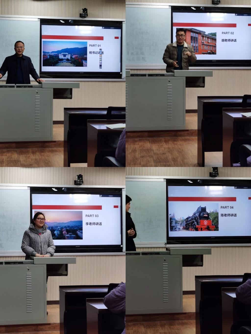 在老师发言环节,党委书记杨雪宾老师像往常一样继续强调读书的重要性,通过广泛的阅读我们愈发能够发现自己的不足之处,提高思想境界、增强精神力量;胡文根老师首先对各位同学在上一学期所取得的成绩表示祝贺,继续强调在第一年需要学会守规矩的重要性,在追求并建议各位同学对自己的未来制作进一步的规划;季娇老师对学院给予自己副班导这样一种近距离接近同学的机会表示感谢,并且表示愿意对各位同学在日常生活中所遇到的困难提供帮助;辅导员陈力瑞老师鼓励各位同学在新学期要继续努力学习,过去的成绩并不代表你永远是这样的,乾坤未定,你我皆是黑马。并且要全方位提升自己的能力,除了学业还可以积极此外,陈老师通过分享自己曾参加武汉大学的学术会议的经历告诉同学们要具备辩证性的思维,并且向各位同学提问“作为马克思主义的学生应当具备什么样的