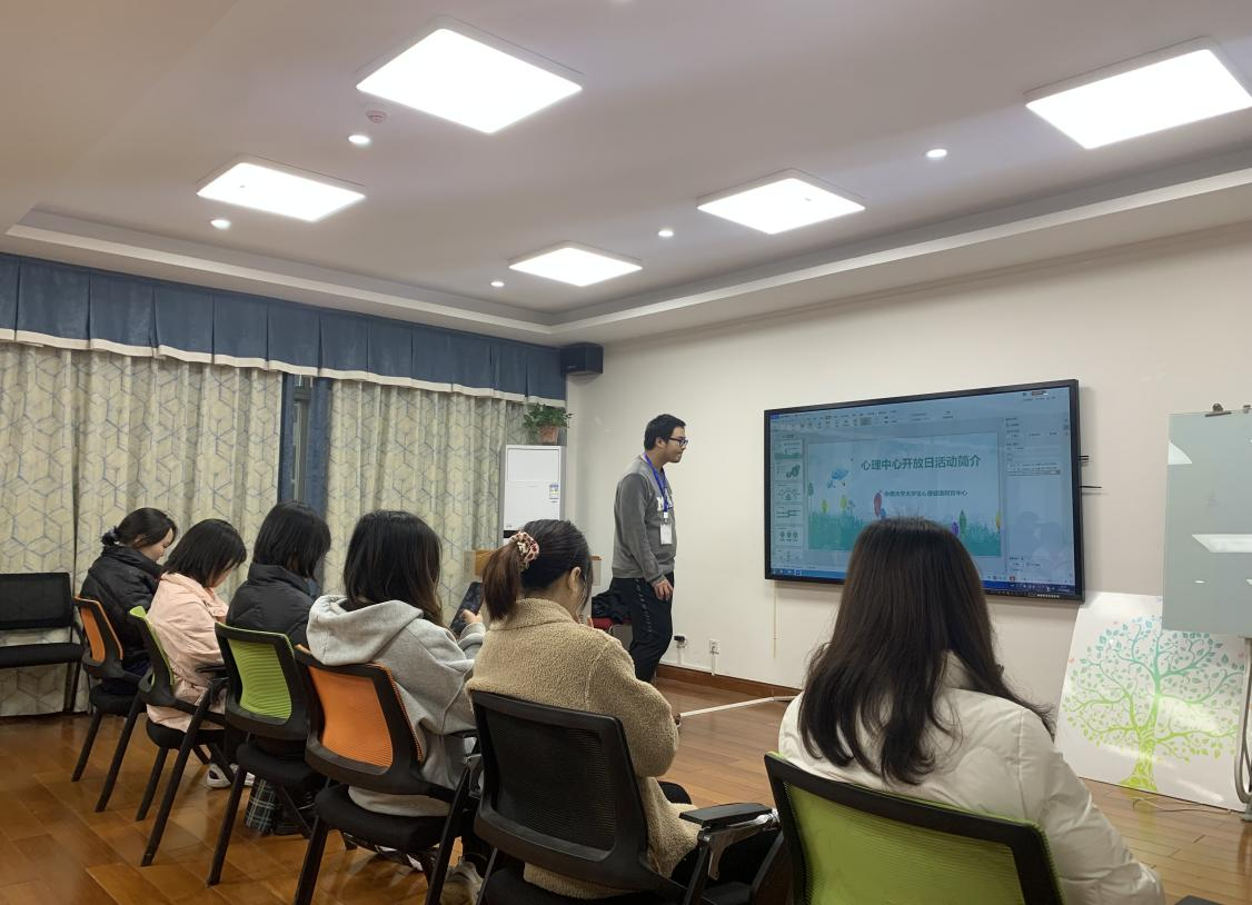 在正式参观前,组织开放日活动的解心员们为同学们介绍了毓秀楼心理健康中心的基本设施、心理咨询预约方式以及心理健康中心为同学们组织的各类心理健康活动。简单的介绍过后,解心员将大家分为了五组,组队依次进入各功能室参观。