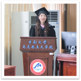 随后,研究生毕业生代表隋嘉奇发言。她表达了对学院领导、老师的感激之情。她表示,马院学子进入社会,无论走出多久,岁月只改容颜,不改属于中南马院的青春和活力,无论走出多远,希望初心永驻,永怀中南人知行合一、经世致用的志向和马院人担马列大道、争做时代英才的精气神。紧接着,本科生毕业生代表李明珠发言。她回顾四年大学时光,感谢有家般温暖的中南马院;院领导的关怀;辅导员秘老师、邹姐和瑞哥无微不至的照顾;班导师材哥的言传身教和学术导师;任课教师的传道授业解惑和父母的全力支持谆谆教诲。她激励马院学子继续拼搏继续奋斗,担当时代重任,为民族复兴、国家富强贡献自己的一份力量!
