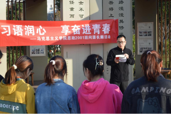 在11月13日上午,为全面解读习近平总书记的讲话精神,鼓励青年学生积极担当起作为思政工作者的责任与使命,作为指导老师的胡文根老师以及思政2001班全体同学在问渠长廊举办了本次以“读习语润心,享奋进青春”为主题的分享会。活动由思政2001班组织宣传委员范雪倩同学主持。
