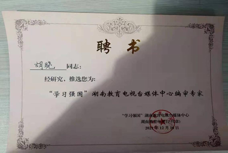 2021年12月19日,“概论中心”胡晓副教授被推选为“‘学习强国’湖南教育电视台媒体中心编审专家”。