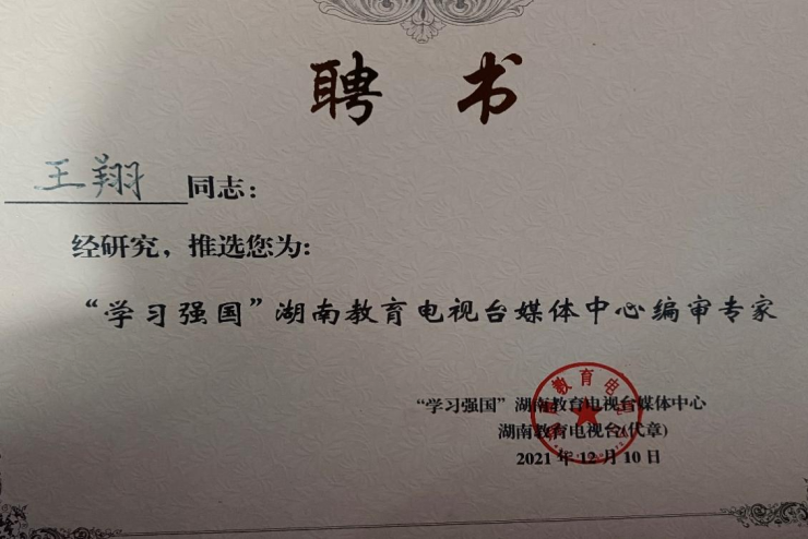2021年12月10日,英国威廉集团官网院长王翔教授被推选为“‘学习强国’湖南教育电视台媒体中心编审专家”。