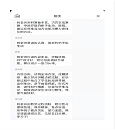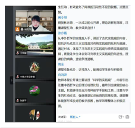 参加听课的马院教学副院长吴争春教授在第二堂公开课后进行了点评,从教学态度、教学内容、教学方法等方面充分肯定了林沈丹和何秋娟两位年轻老师的公开课,同时也提醒老师们注意:在线教学更需加强与学生的互动,不仅要做好“怎么教”的教学设计,更要琢磨“怎么学”的学法设计,让线上课堂牢牢抓住学生,吸引学生的注意力,使线上课堂与线下课堂教学质量和教学效果“同质等效”,进而“提质增效”!