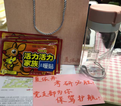 2022届考研倒计时已经敲响,2018级的马院学子们即将迎来考研的“战场”,为了帮助考研学子坚定目标、调整心态、树立信心,马克思主义学院第一党支部组织开展了“考研送温暖”志愿服务活动。通过送“暖心礼包”、送午餐、送祝福视频等多样化的活动形式,为考研学子准备了十分贴心的礼物,送上了温暖的问候与亲切的祝福。