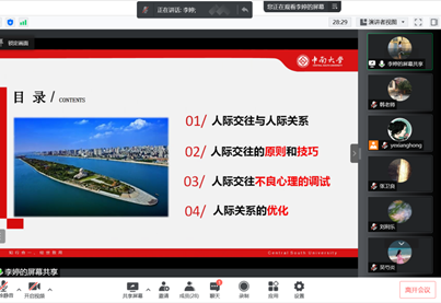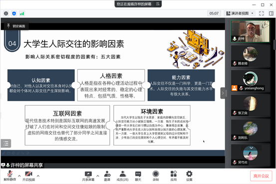 许名健老师和李婷老师围绕同一主题“人际交往”展开了不同的阐释,介绍了人际交往与人际关系的定义、人际交往的功能、人际吸引因素、人际交往心理效应、大学生人际交往的特点、大学生人际交往的影响因素、大学生人际交往中常见的问题以及调适并优化人际关系的方法等。