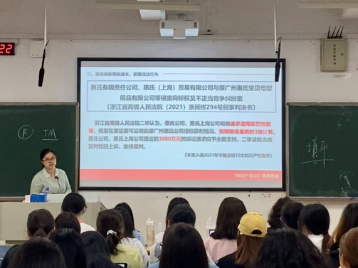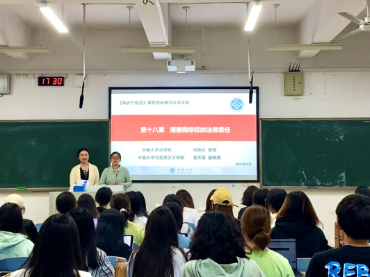 作为课程思政教学改革实践,本课程采用了“专业课+思政课”双师同堂授课的模式。先由何炼红教授对课程要求和内容进行整体介绍后,姜芳蕊老师向同学们介绍了习近平总书记就知识产权保护问题的重要讲话精神和国家重大战略规划,进而引出本堂课的教学主题,帮助学生从宏观层面理解商标权保护与国际一流营商环境、知识产权强国建设之间的内在联系。接下来何炼红教授结合“茶颜悦色”系列案件对商标权侵权的认定进行了生动而详细的理论讲授,并整体介绍了商标侵权的法律责任。再由姜芳蕊老师专门就2019年《商标法》修订的重要内容“惩罚性赔偿”问题与“营造良好营商环境”“鼓励诚信经营、公平竞争”“构建有序、健康的社会主义市场经济”等思政元素相结合进行了讲解,进一步加深了学生对习近平总书记强调的“提高侵权代价和违法成本,震慑违法侵权行为,营造良好营商环境”认识。