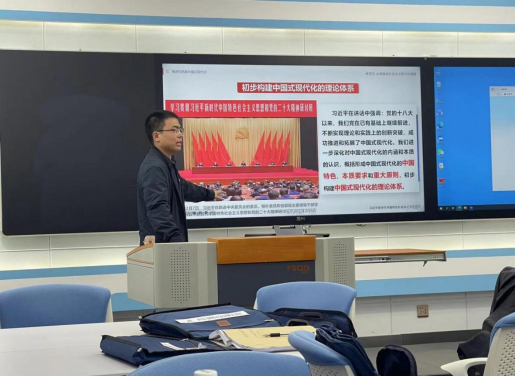 在权威解读环节,参会老师认真学习了中国人民大学陶文昭教授的“坚持和发展中国特色社会主义总任务”视频讲座。教学提升环节则是秘金雷老师进行了“全面建设社会主义现代化国家”的教学展示,秘老师围绕全面建设小康社会、全面建设社会主义现代化国家以及中国式现代化理论体系的教学重点,进行了一场生动有趣的说课。