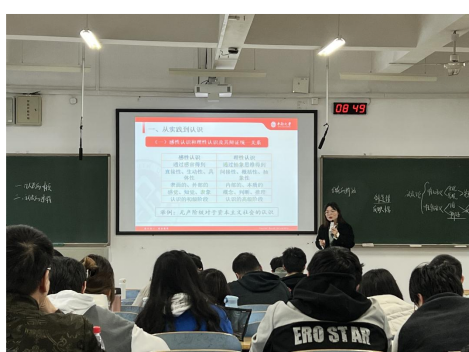 青年教师杨愉博士在4月6日以“马克思主义的认识论”为主题,进行了一次精彩的“马克思主义原理”课程的公开课教学。众多督导专家从她的教学语言到内容设计,从教学工具到板书呈现等,进行了高度肯定性点评。孙梦云督导认为,杨愉老师一气呵成讲了两节课,提出问题——分析问题——解决问题,每个环节设计精准巧妙,理论性、知识性、实践性都很强。刘新庚督导认为此次公开课有四个特色:即观点正确、引领先进,体系完整、重点突出,解读性强、表达精炼,精心设计、逻辑严谨。王希俊督导围绕如何抓住学生注意力,如何在课堂上对接老师与学生发表了个人见解,引起了在座青年教师的思考。肖铁肩督导和荣复康督导在上述点评的基础上,还针对杨愉老师的课件制作水平给予了高度肯定,认为动态板书、动态课件的方式非常合适,容易引导学生正确学习与思考。王稳良老师在表扬优点的基础上,针对杨愉老师课堂设计的要点给出了中肯建议,提出教学可以先讲解概念,再围绕概念讲清楚线索,继而针对线索当中的一个个问题深入阐发,这样更便于给学生留下深刻印象。督导专家也就马原课堂应该如何调动学生积极性、板书设计与课件设计一一对应、案例选择应更多联系学生专业实际等,提出了富有普遍指导意义的积极建议。