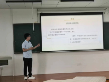 2023年6月7日下午,中国近现代史纲要教研中心本学期第四次集体备课会在学院401室举行。本次备课会围绕纲要课教材第八章“中华人民共和国的成立与中国社会主义建设道路的探索”展开教学展示及研讨。教研中心主任胡腾蛟老师主持,学校学院督导专家、教研中心老师们参加了备课会。 主讲环节,蓝天老师以“敢教日月换新天——新中国的成立与社会主义道路的选择”为题,从教学目标、逻辑框架、内容安排、活动设计等方面进行教学展示。他紧紧围绕“没有共产党就没有新中国”、“没有共产党就没有社会主义道路”两个主题展开,逻辑清晰、目标明确。在教学安排、内容表达、师生互动等环节的设计上,力求深入浅出、活用史料和贴近学生,具有一定的特色。如课程导入上,通过介绍革命文物——毛泽东主席在开国大典上使用的话筒,引导学生重温“共和国之声”,感受新中国成立时的历史图景;在介绍“新中国成立初期面临的考验”与“捍卫巩固新政权的斗争”时,用“有困难”“有办法”“有希望”三个中心词凝练概括,便于学生理解和把握历史脉络;在讲授“党在过渡时期的总路线及其实施”时,用历史情景模拟再现的方式,帮助学生理解新中国成立后“三大改造”的基本历程和重大意义。